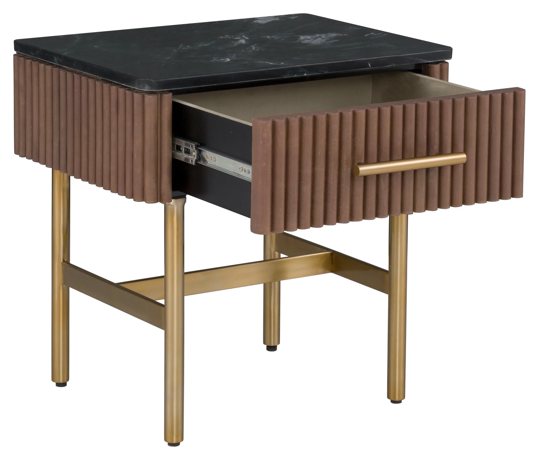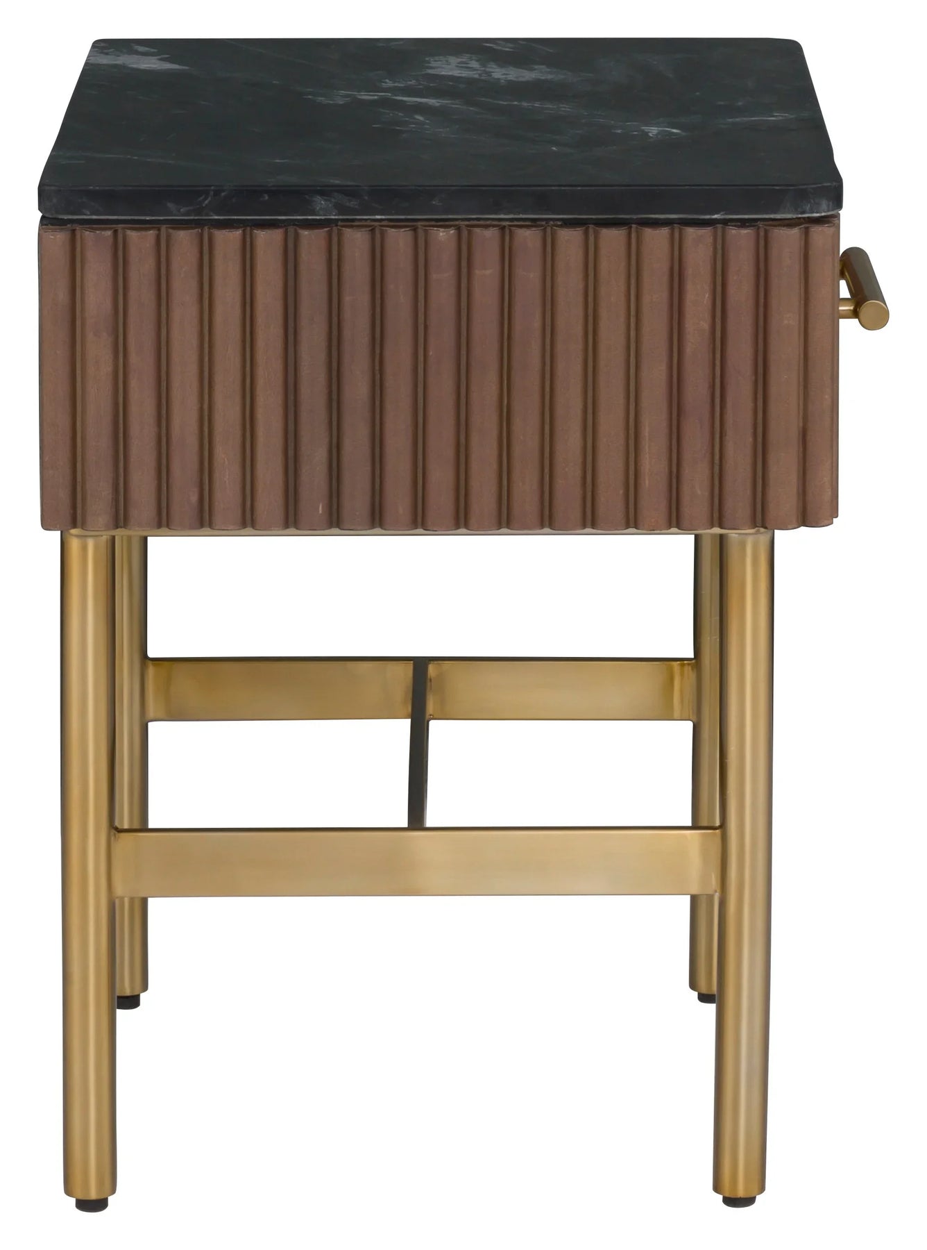 Features One Drawer. Leather Wrapped With Galaxy Black Marble Top And Aged Gold Metal Base.