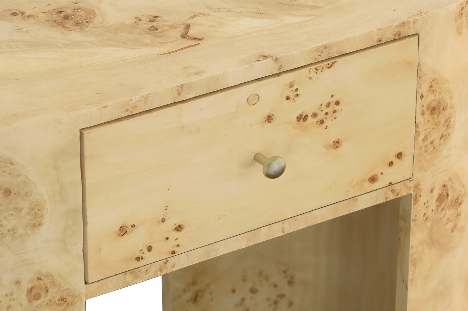 The Sequoia Collection features Mappa Burl veneers. Mappa Burl is a highly decorative veneer in light brown heartwood is peppered by an unusual darker, bark-like pattern of tight clusters. As Mappa Burl is a natural product from individual trees, each cut of veneer will vary slightly. Sequoia draws upon transitional designs and shapes.