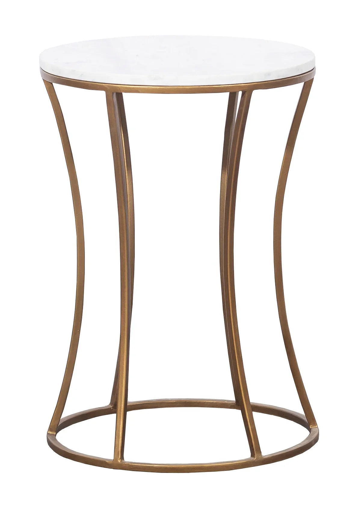 Veneto features hand-forged, hammered metal finished in a classic Antique Gold and sleek Calcutta stone tops. The elegant silhouettes, refined scale, and sleek finishes are an unexpected juxtaposition to the hammered metal execution.