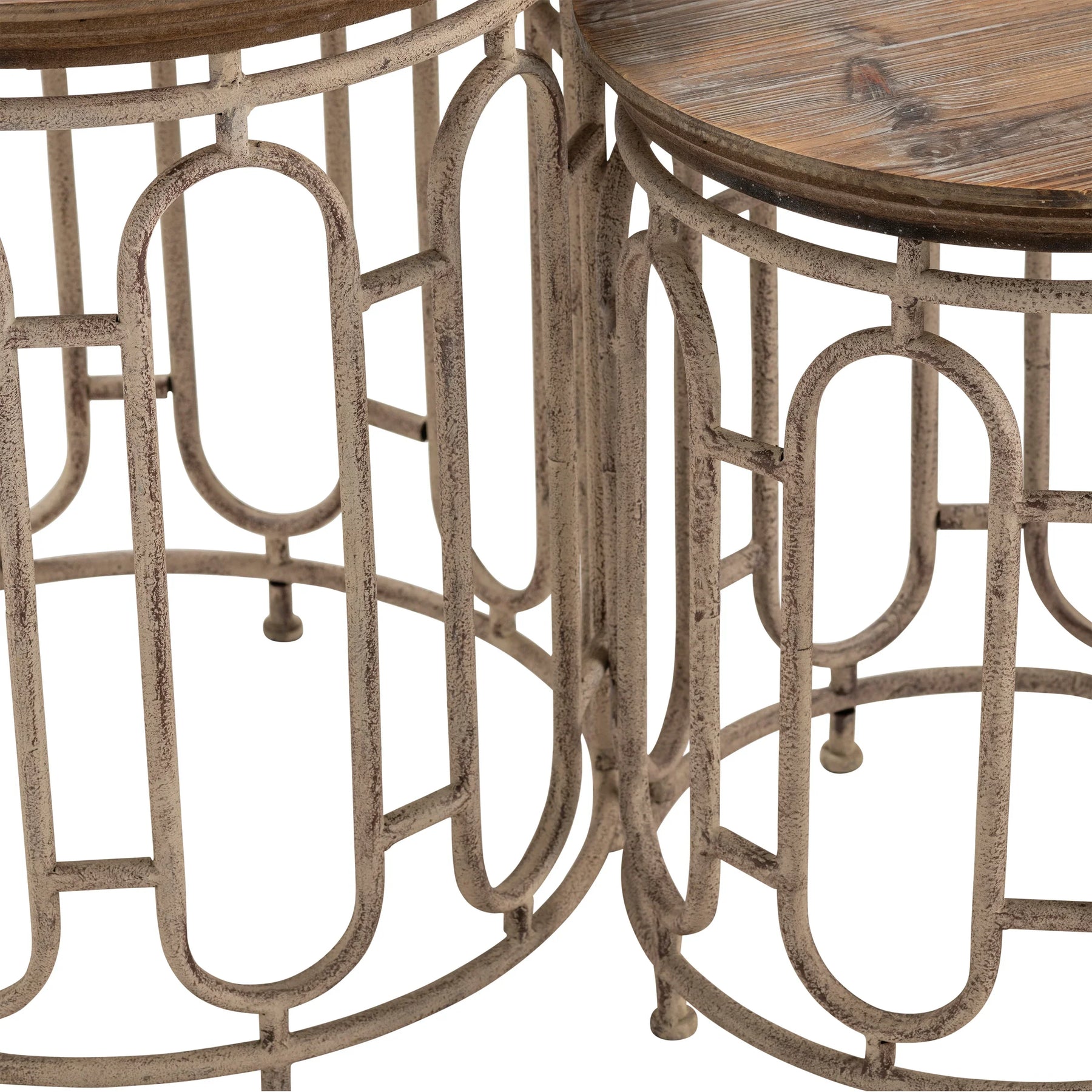 Double your surface, halve your footprint. Two round tables nest together: rustic acacia tops highlight live knots and grain while sand textured iron cages supply vintage art deco flair. Pull the smaller table out for guests, then tuck it back to save space.