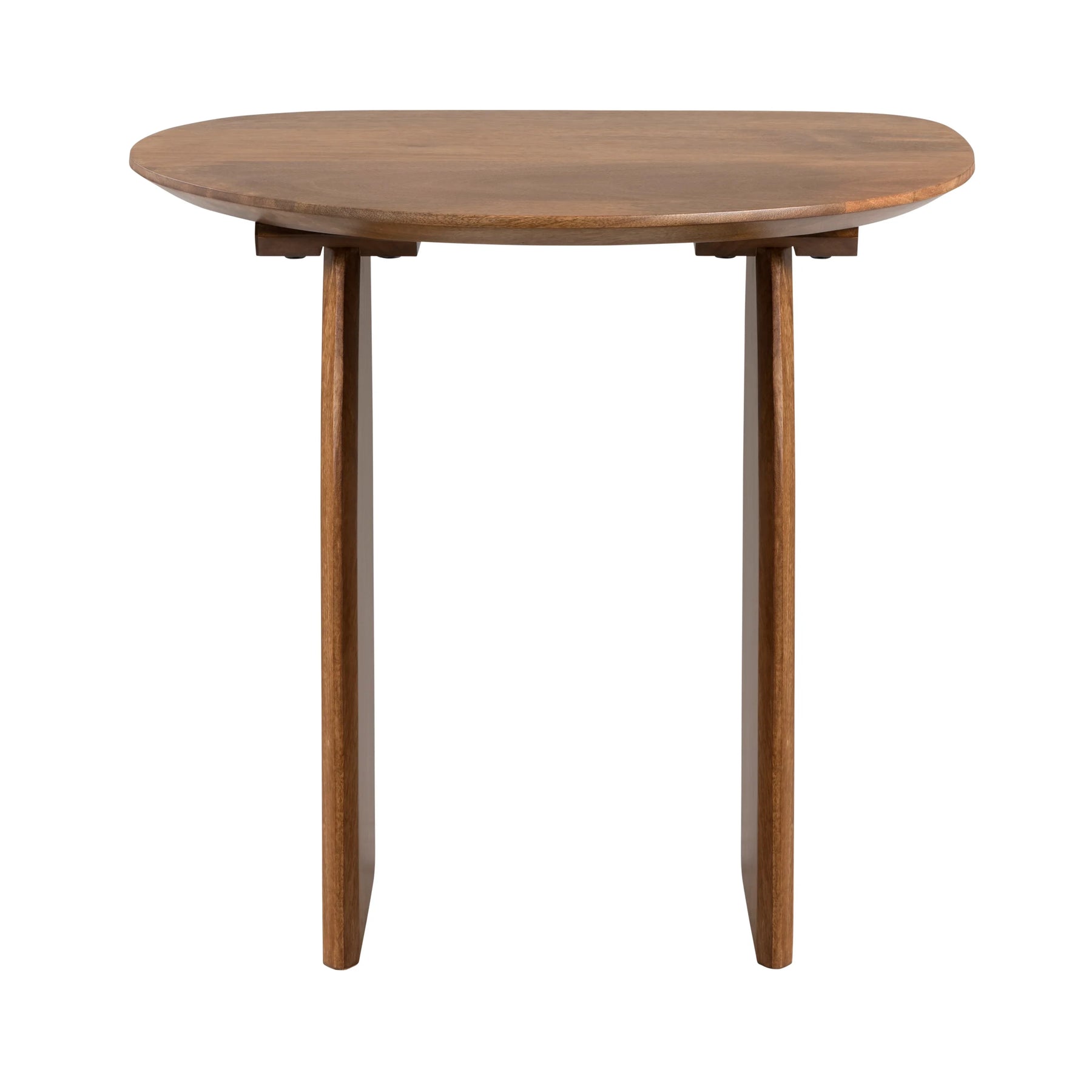 Enhance your space with this end table, crafted from solid mango wood in a stained warm brown wood grain finish. Featuring a round top and two gracefully curved legs positioned at an angle, this design creates an airy, modern aesthetic. Equipped with level adjusters for stability, it requires only minor assembly—just attach the legs. A versatile accent piece, this table blends style and function for a refined yet practical addition to any room.