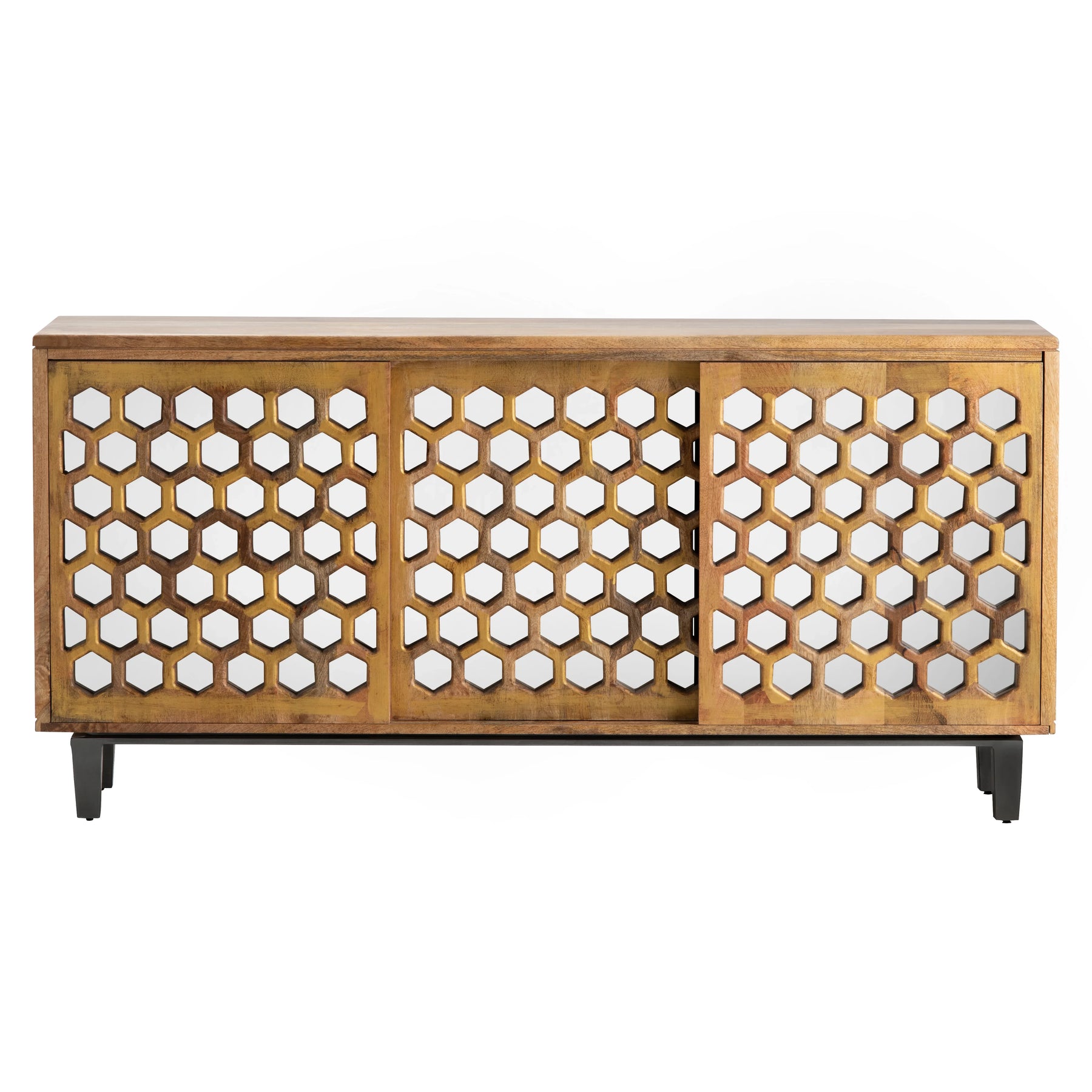 Slide open a hive of style. A trio of mango?wood doors laser?cut into graphic honeycomb panels glide smoothly to reveal ventilated component bays. Black iron legs lift the 70?inch console for an airy feel while rear cord exits keep streaming gear clutter?free.