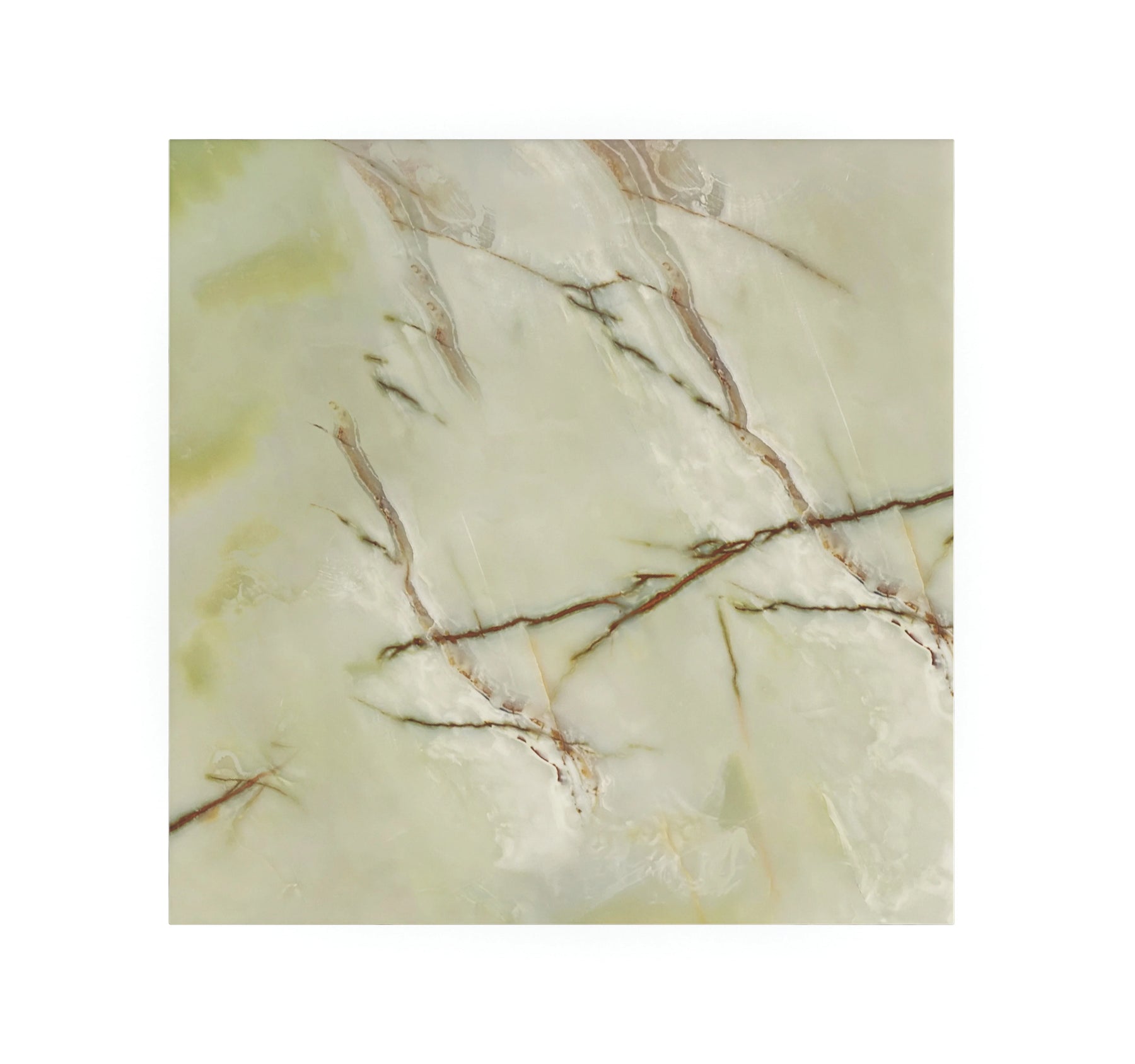 Intersecting planes form this simple yet striking modern end table, crafted in a mix of wood, stone, and metal. Vertical planes in a warm Lucent Bronze Metallic add shimmer and support to its highly figured green onyx top with a luxe, jade-like appearance. A Retro Walnut wood shelf on bottom beautifully balances its minimalist aesthetic and offers space for creative display.