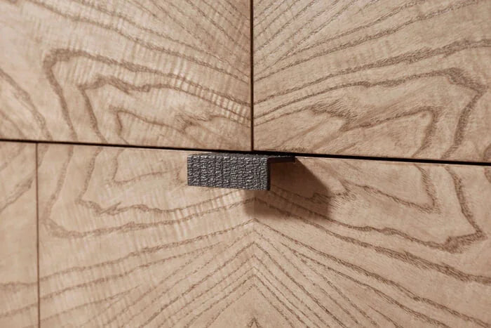 Sleek seven drawer bedroom dresser made of figured cathedral ash available in Dune or Earth with textured metal pulls in our Ember finish and soft close drawers.