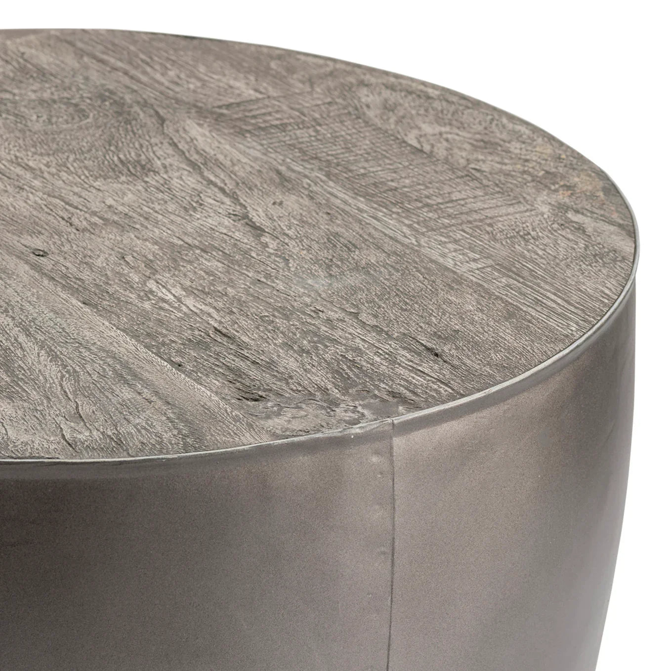 Ground your seating area with cool industrial elegance. A hand?formed brushed?pewter drum hugs a weathered mango?wood top, creating a rich mix of metal and grain. The compact round perch is sturdy yet light enough to move wherever an extra surface is needed.