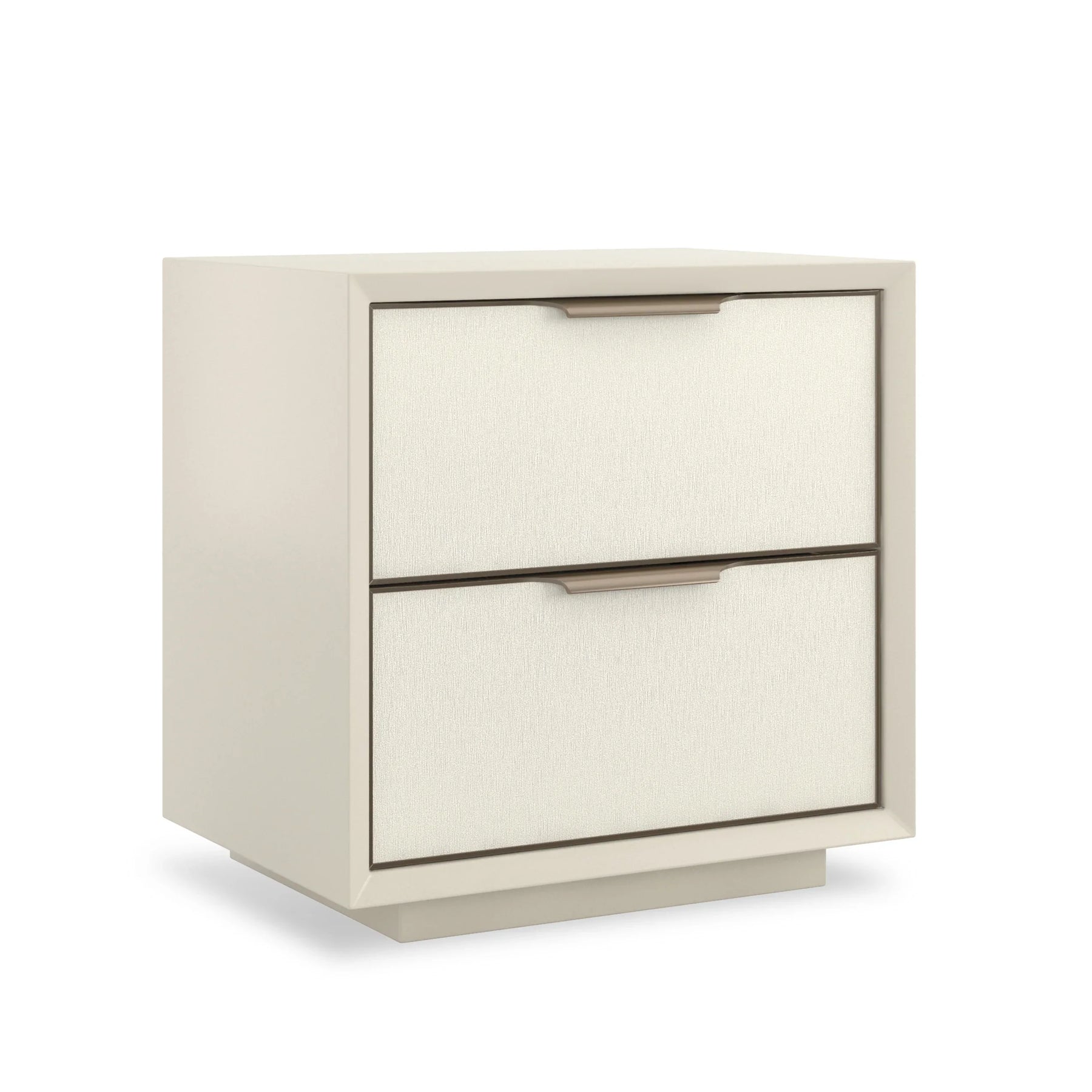 A light-colored, refined mix of materials and finishes are showcased in this euro-modern-inspired bedside nightstand. Encased in Almond Milk, two deep drawers stand on a plinth. Each drawer features textured vinyl fronts with the appearance of pearlized silk. Champagne Gold metal trim frames the two drawers that incorporate soft edge pulls.