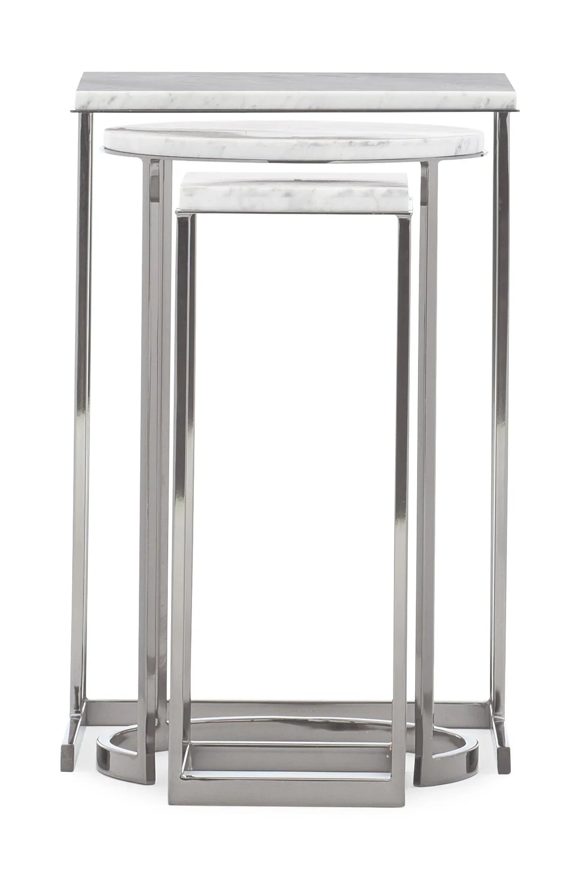 With three times the function and triple the flair, these nesting end tables are destined to become a favorite. Keep them stacked most of the time and pull them out when you’re entertaining or need more room for beverages or snacks. Topped with luxurious Carrera marble and finished in Plated Nickel, each one is intriguing on its own—but nest them together and you have a remarkable design solution with modern appeal.
