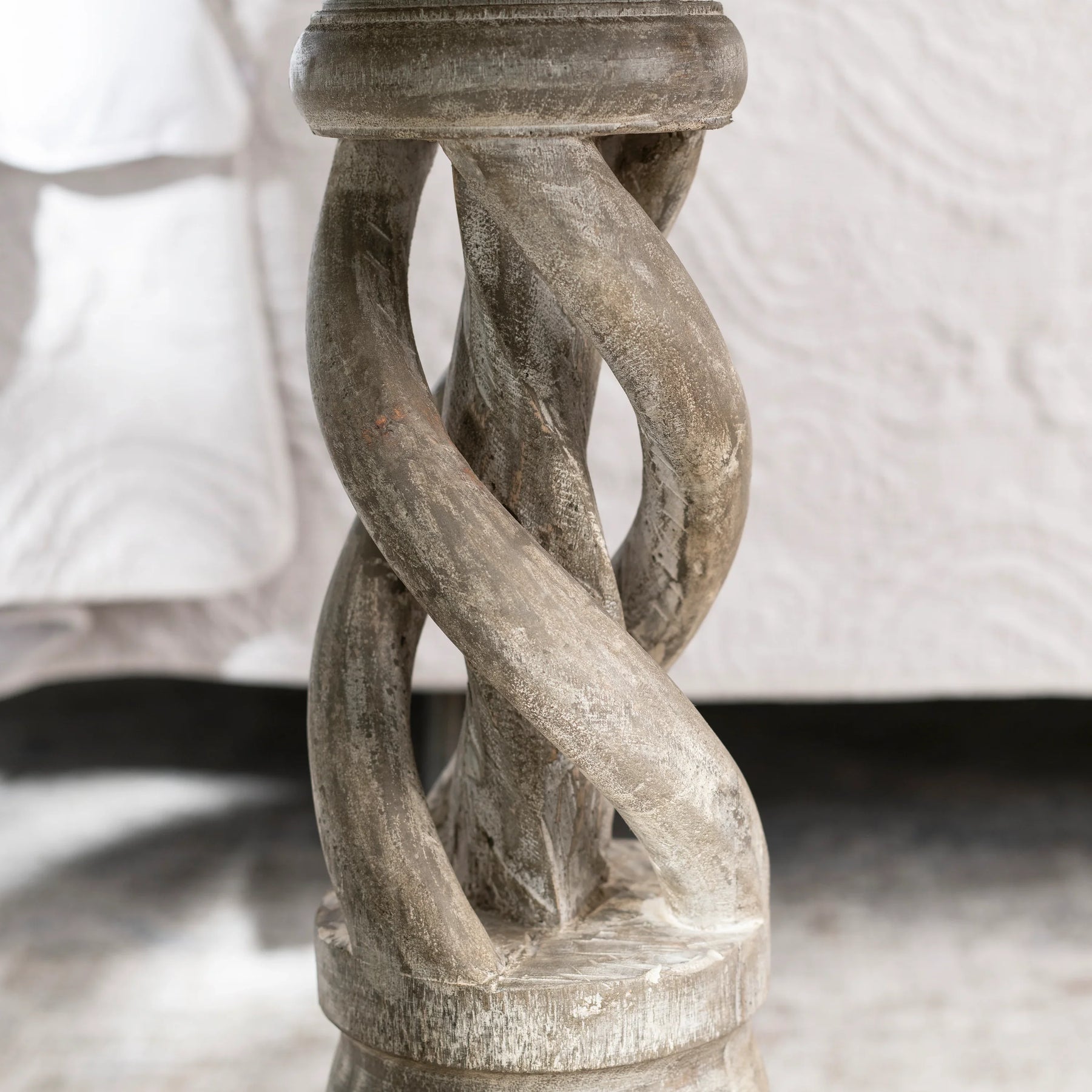 Add a touch of romance to your home with our round accent table. Crafted from Mango wood, it showcases a natural wood grain finish enhanced by a wire brushing technique. The whitewashed finish with a dark brown undertone exudes rustic charm. Featuring a hand-carved open twisted body and a plank-style top, it sits gracefully on a four-corner pedestal base. This exquisite piece seamlessly blends elegance and functionality, making it the perfect accent for any room.