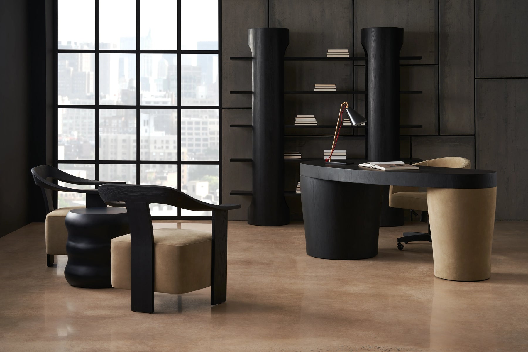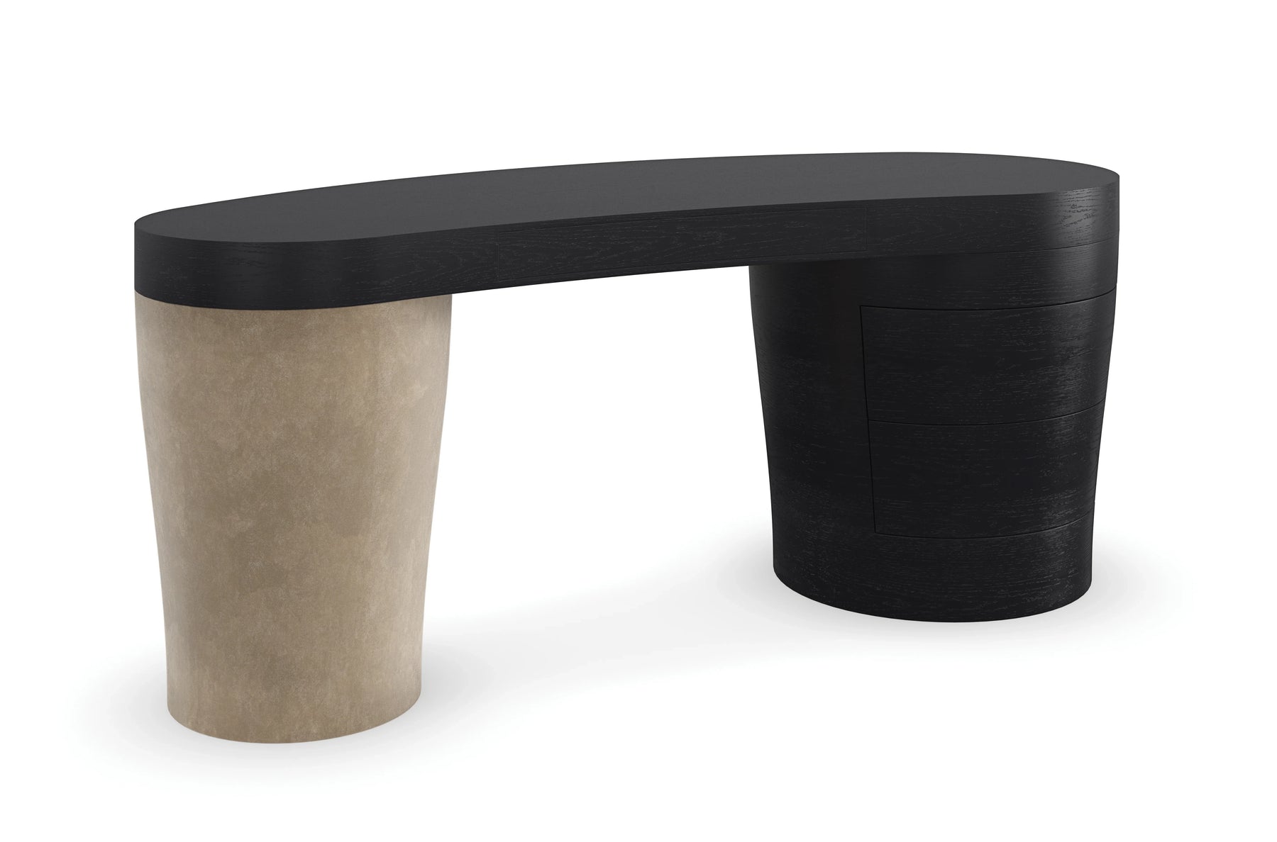 An elegant expression of form and functionality, this sculptural desk instantly elevates any work space. Creative and captivating, it features an expansive wood veneer top, balanced on rounded legs in an unexpected material mix: soft suede contrasted by a striking matte black finish. Its seamless design features a center drawer and two additional drawers within the right-facing leg for neatly keeping office essentials.