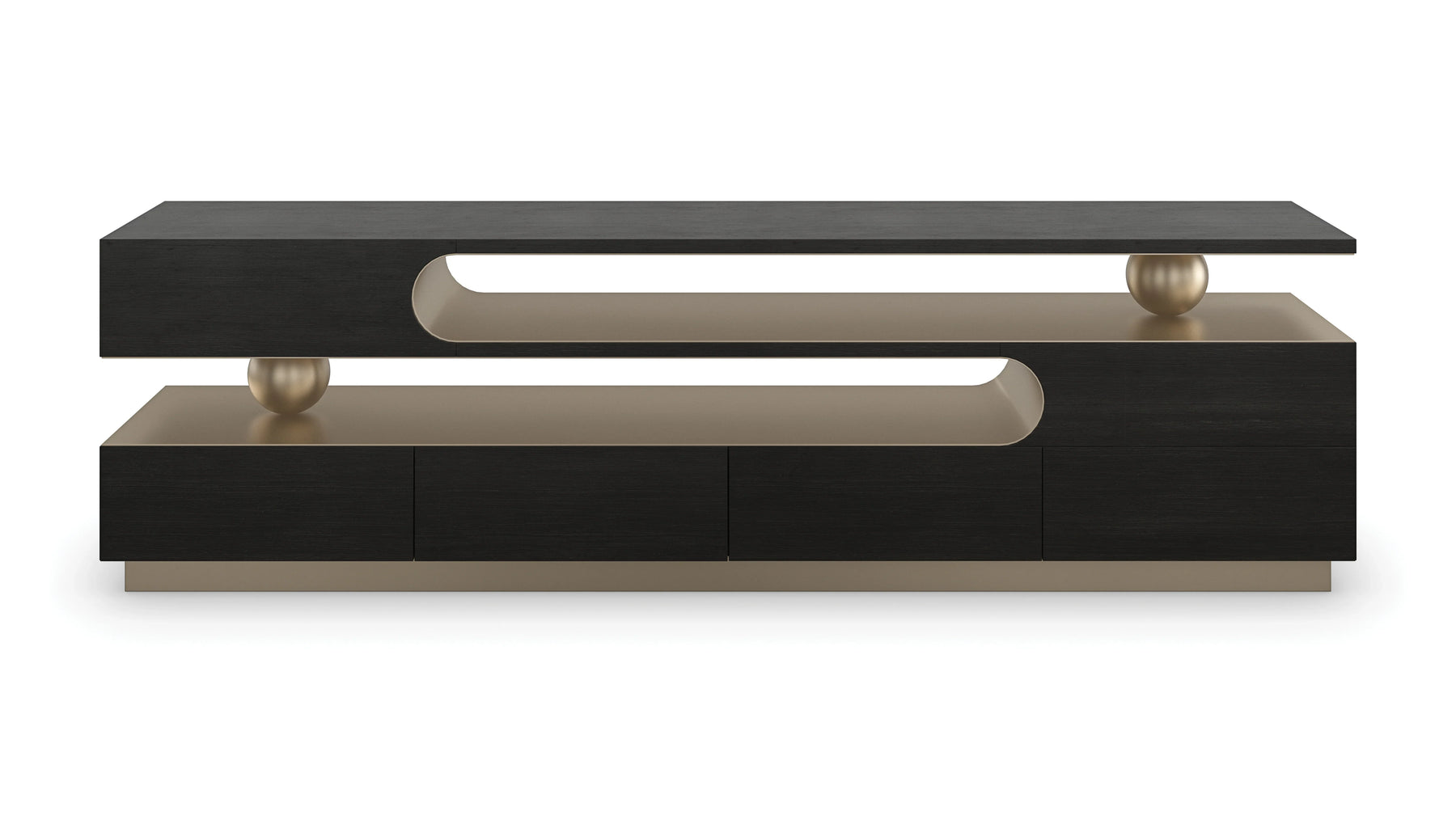 A striking balance of form and function, this console makes clever use of space and shape to create a sense of movement and rhythm. Two metal spheres guide the eye along clean lines and curves, warmly articulated by a Lucent Bronze Metallic finish. Features four, soft-close drawers with bottom pulls and painted interiors for an added luxe touch. Style in a media room, or make a memorable first impression in a hall or entryway.