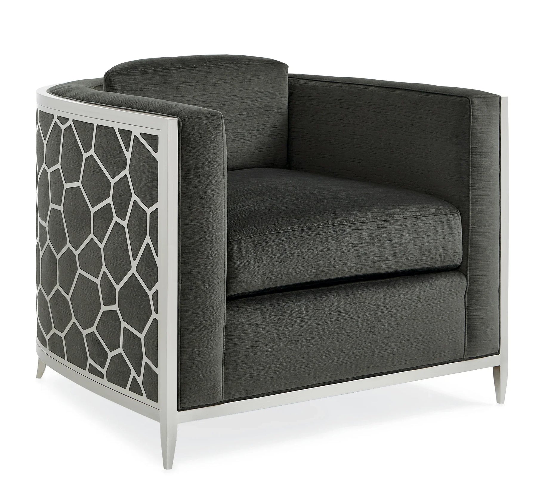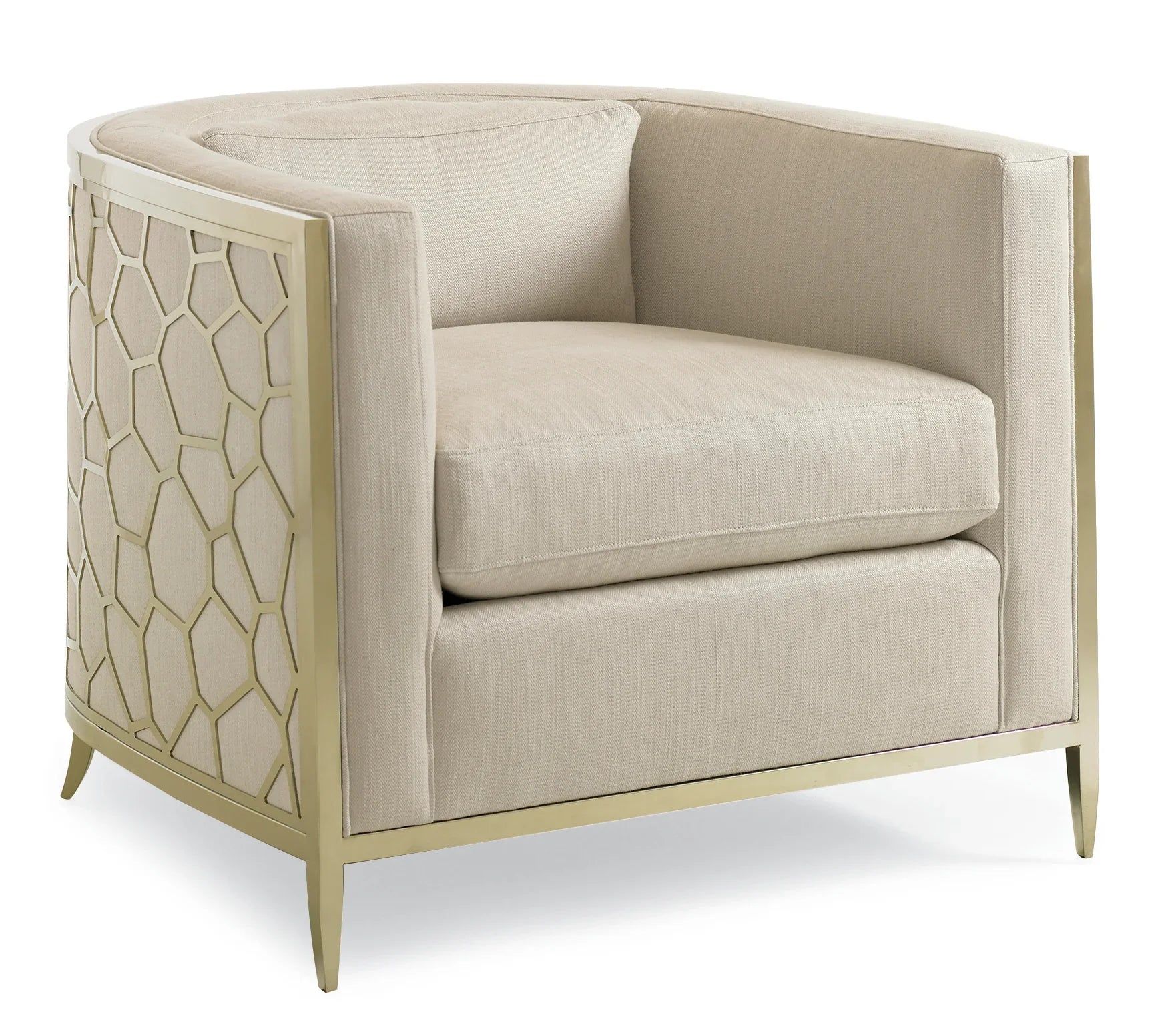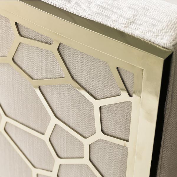 Get the party started with a chair they’ll be talking about long after they leave. We design our product with our clients’ satisfaction in mind. Custom engineered frame wrapped in a Gold Bullion metal tone. A micro-herringbone pattern in off-white linen-blend fabric offers simplistic beauty.