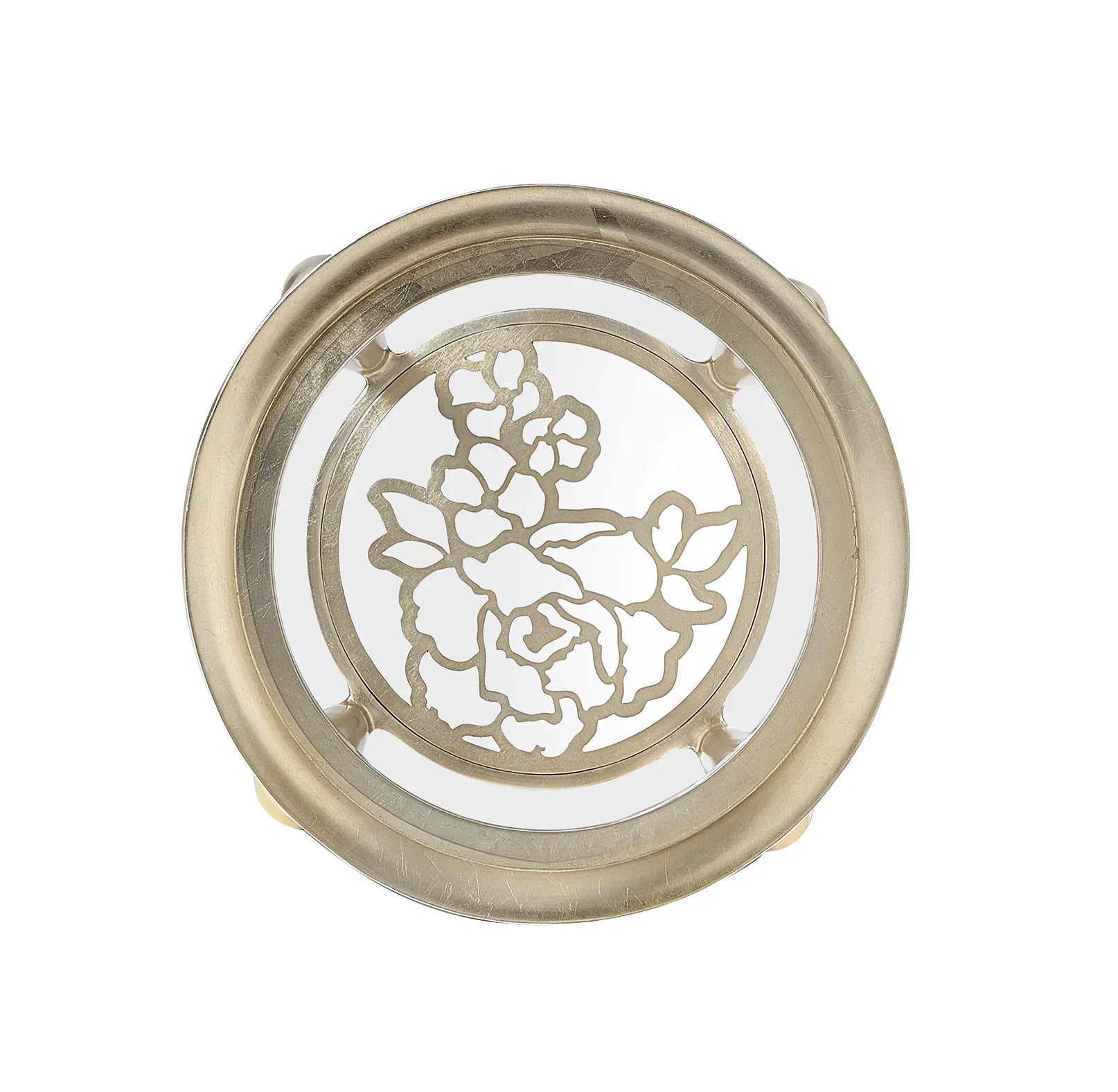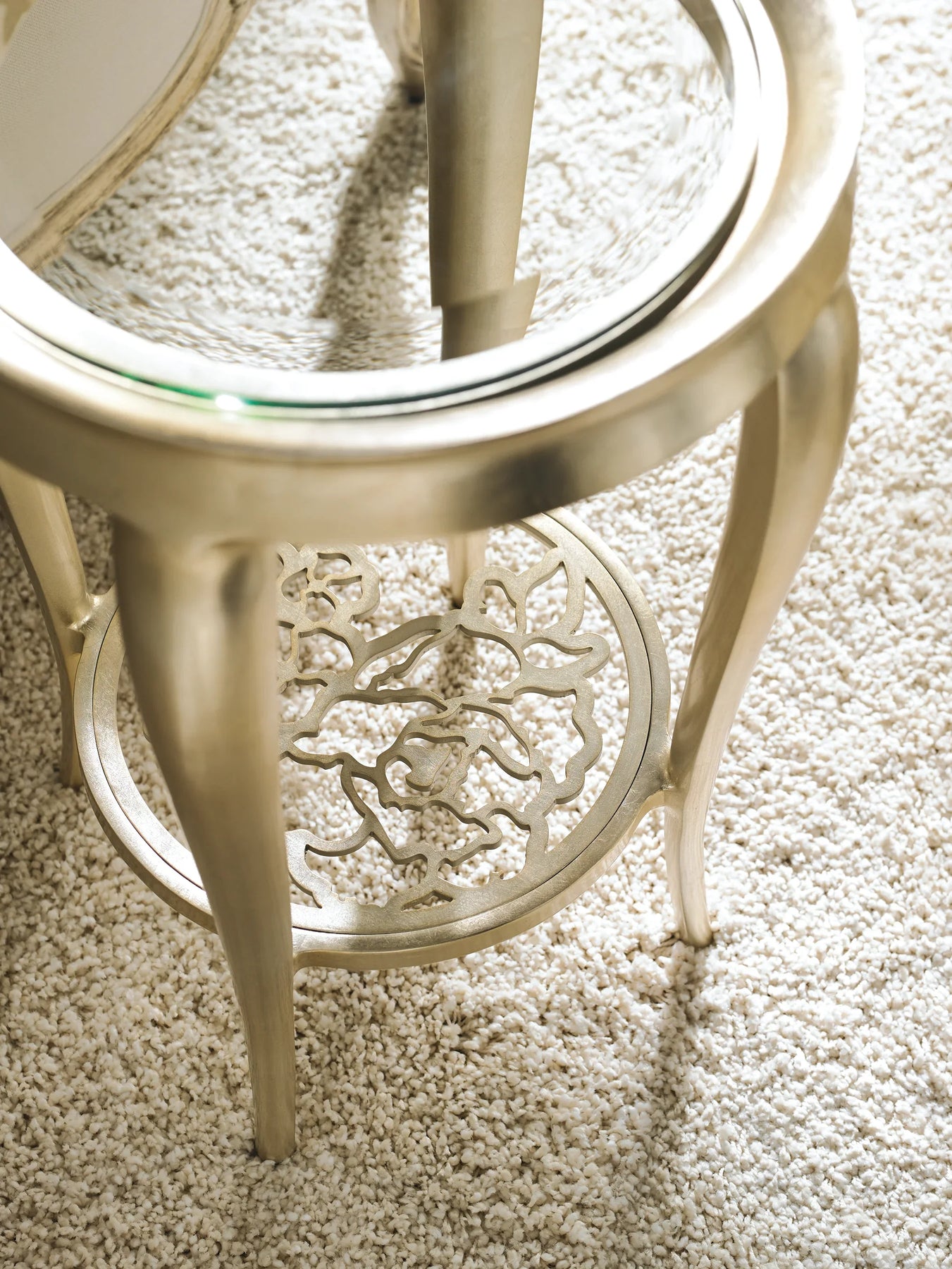 Cut metal grilles come to life in this end table that easily blends with other designs. This small table is luminous with its beveled glass top surrounded by a wide concave metal apron and graceful cabriole legs, bathed in Oracle finish. This petite piece’s updated style exhibits a metal stretcher of cutout flowers arranged in a geometric pattern. This bouquet is Just For You.