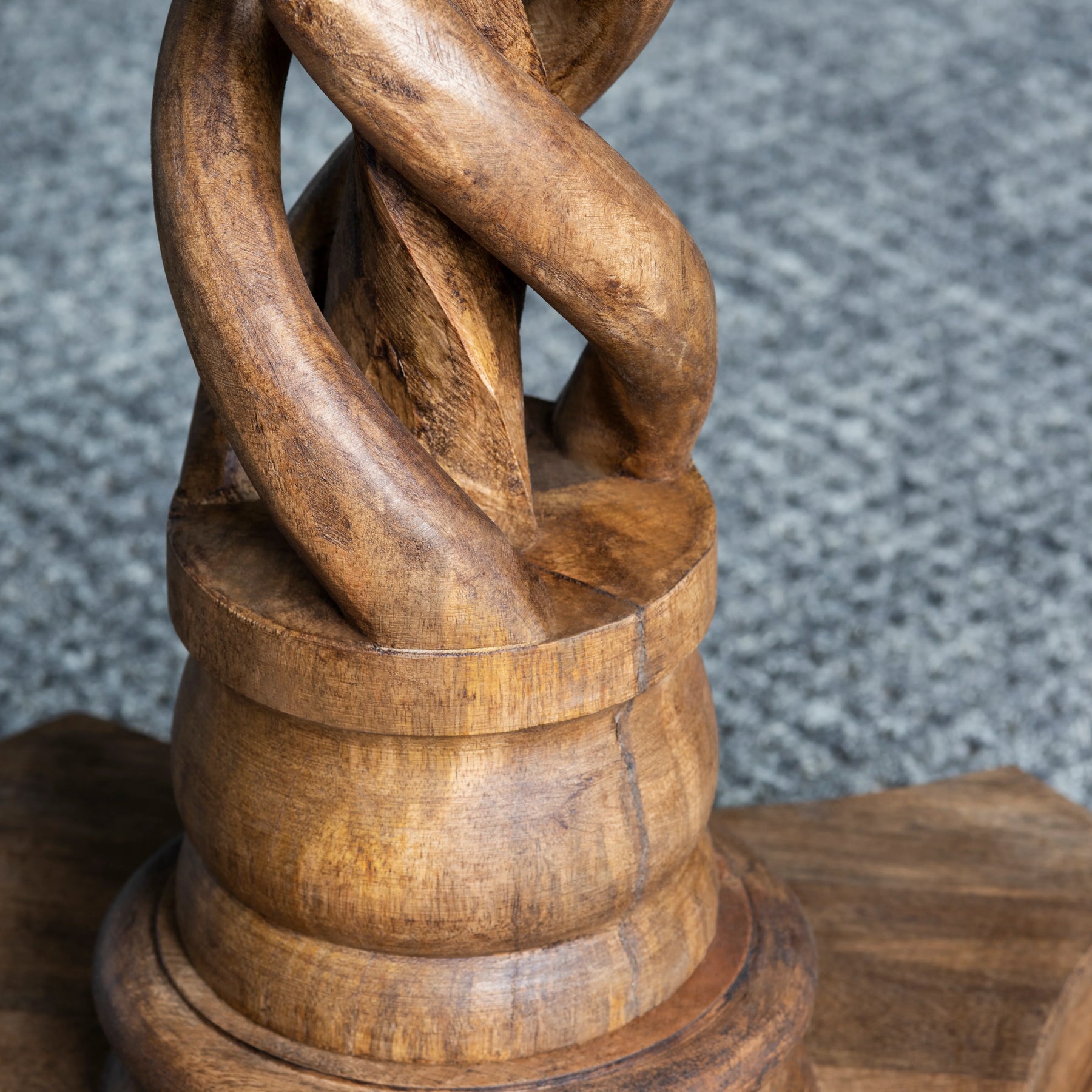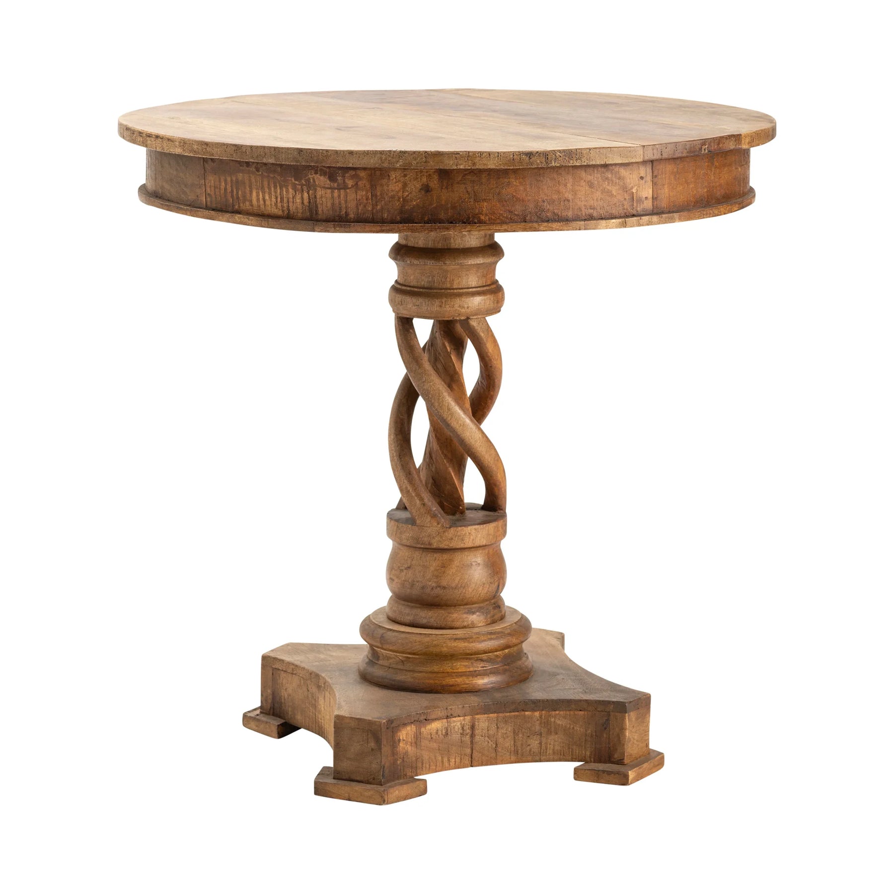 Introduce rustic romance to your space with our round accent table. Crafted from Mango wood, its medium brown finish showcases natural wood grain variations for unique charm. The hand-carved, open twisted body and plank-style top add artisanal elegance, while the four-corner pedestal base ensures stability. Complete with adjustable levelers, this table seamlessly blends style and functionality, making it a perfect addition to any room.
