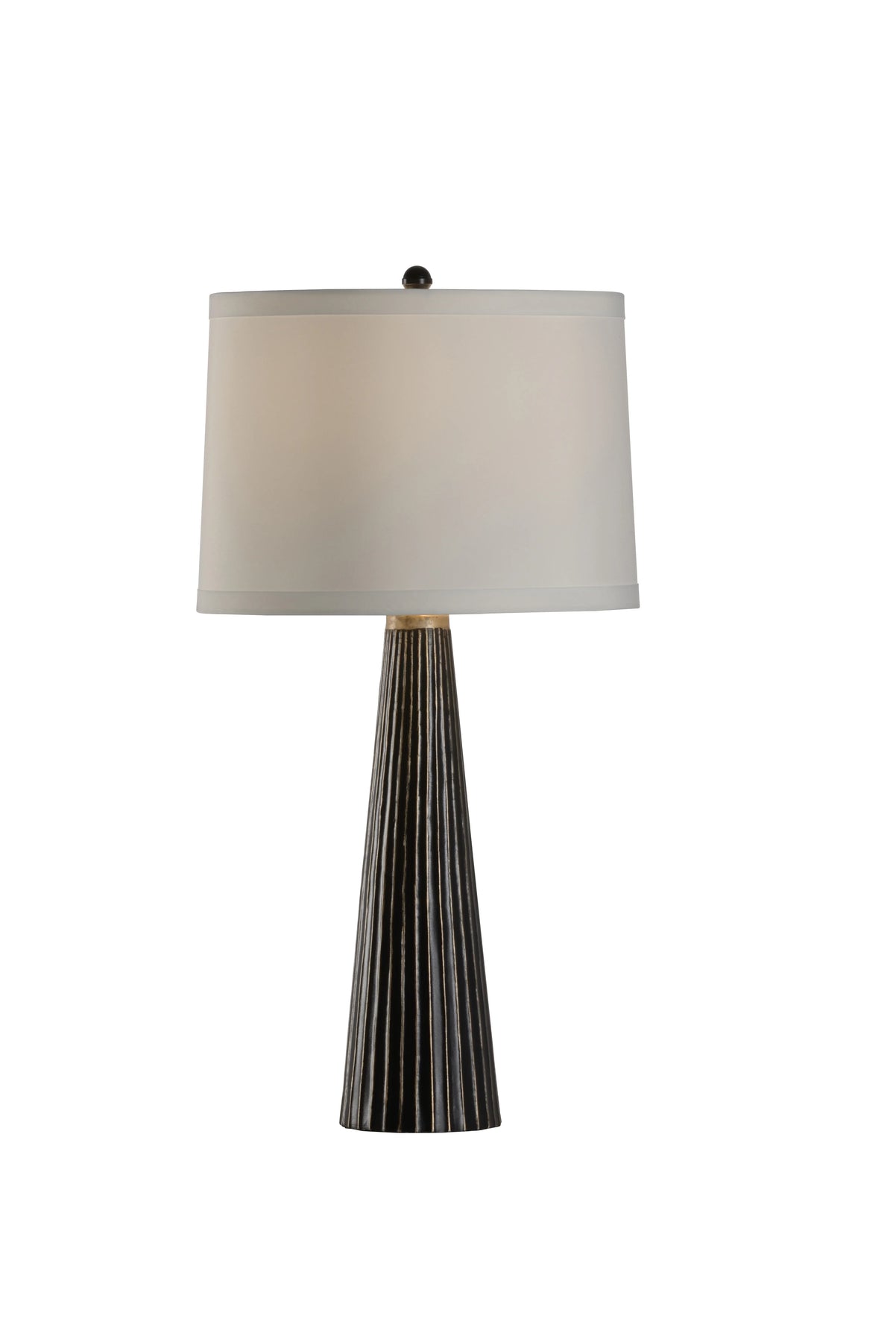 Reminiscent of the industrial era, Lachlen Column Lamp has an aged bronze finish with golden highlights. The off white silkette drum shade provides a classic element that directs light down the tapered silhouette.
