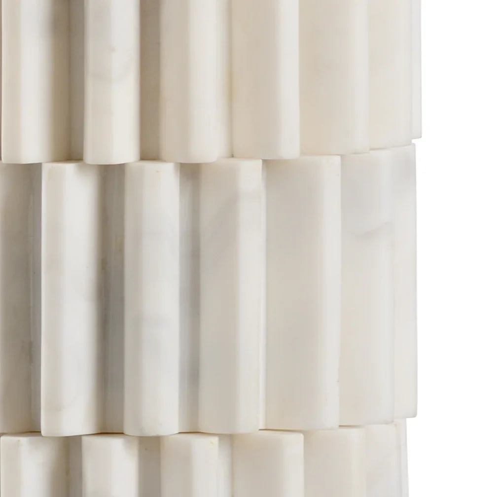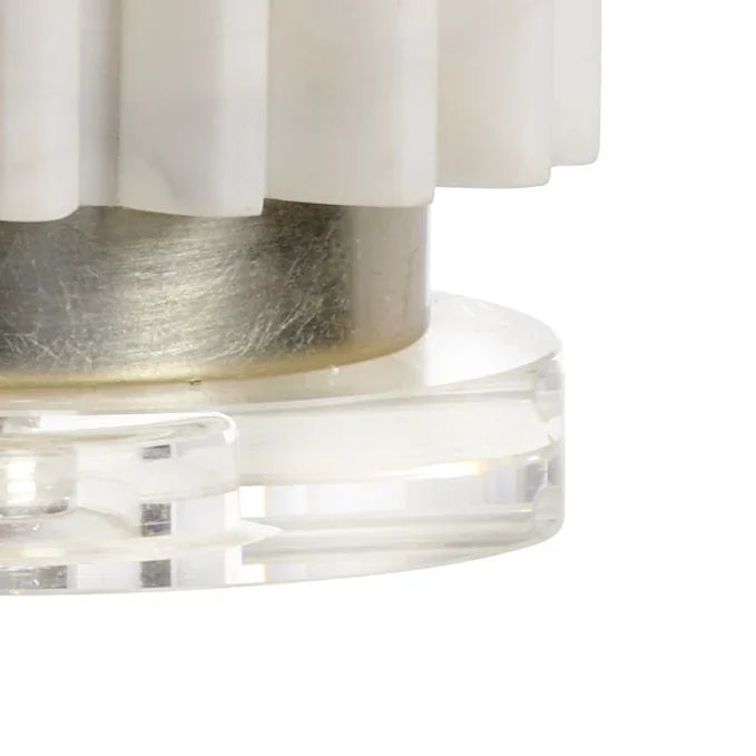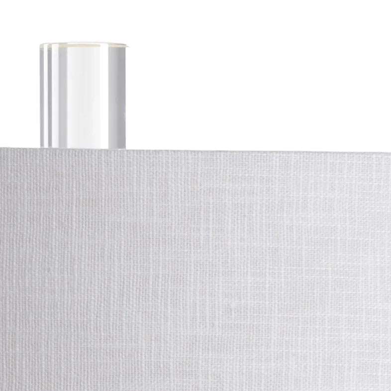 Our modern interpretation of industrial gears, Langdon Lamp features a cast of natural white faux stone on a crystal mount. Secured with a clear acrylic finial, the off-white linen drum shade softens the masculine look and enhances the neutral design.