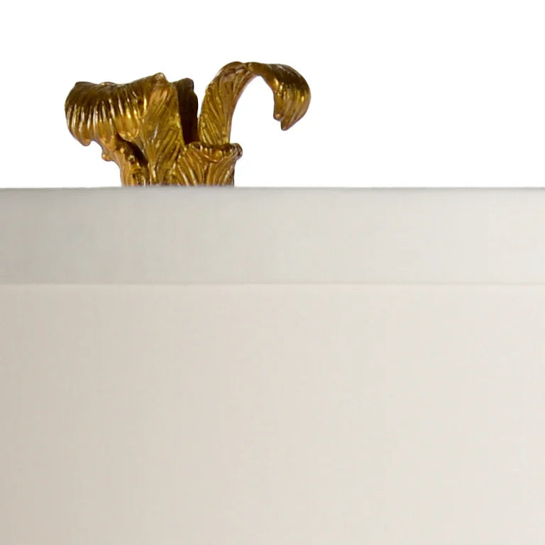 Inspired by the vintage wheat sheaf designs, leaf lamp consists of antique gold leaf finished stems wrapped with a metal rope and supported by a clear acrylic base. This 32" iron table lamp is topped with an off white silkette drum shade that diffuses light reflecting off of the warm gold finish, ideal for a farmhouse or coastal retreat.
