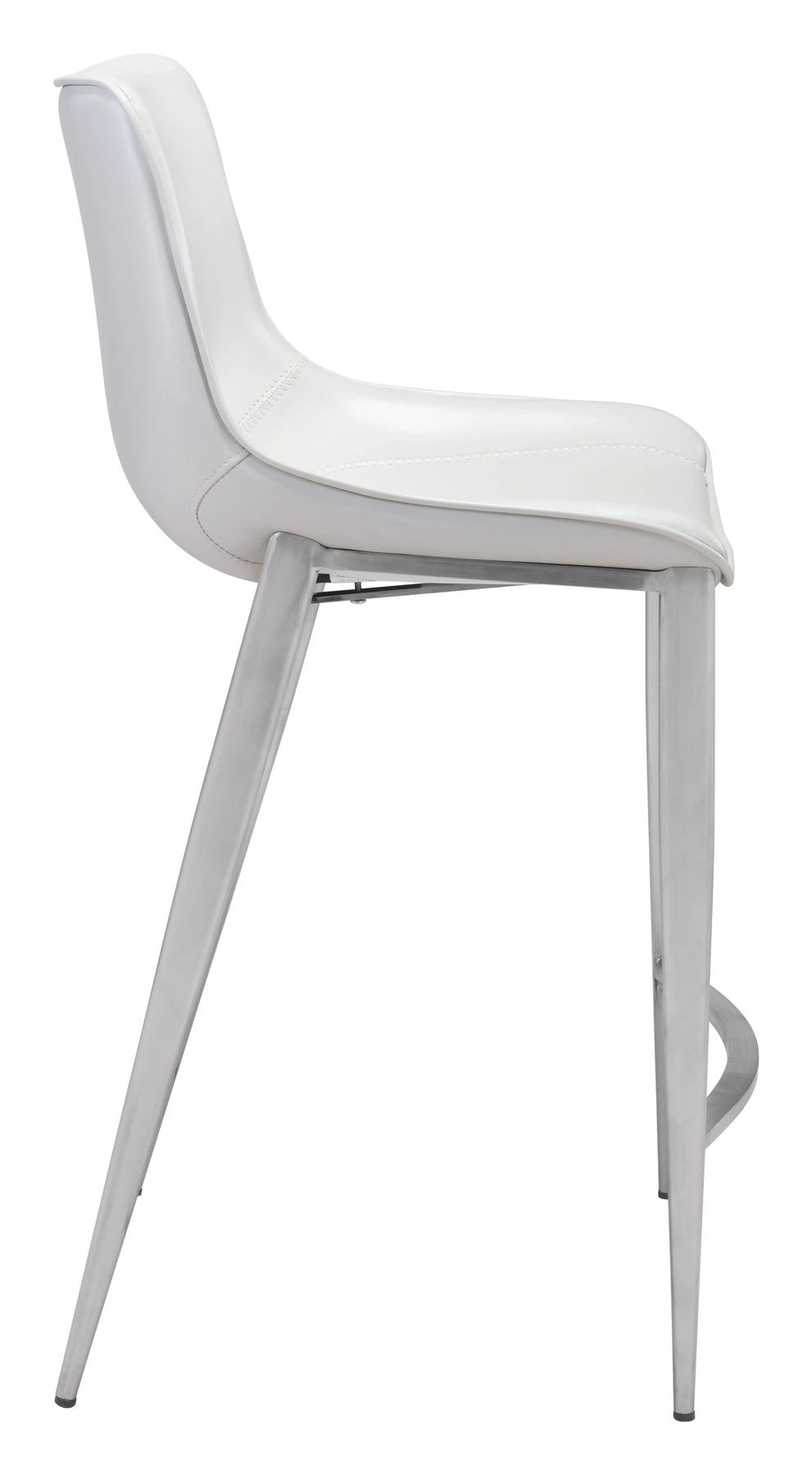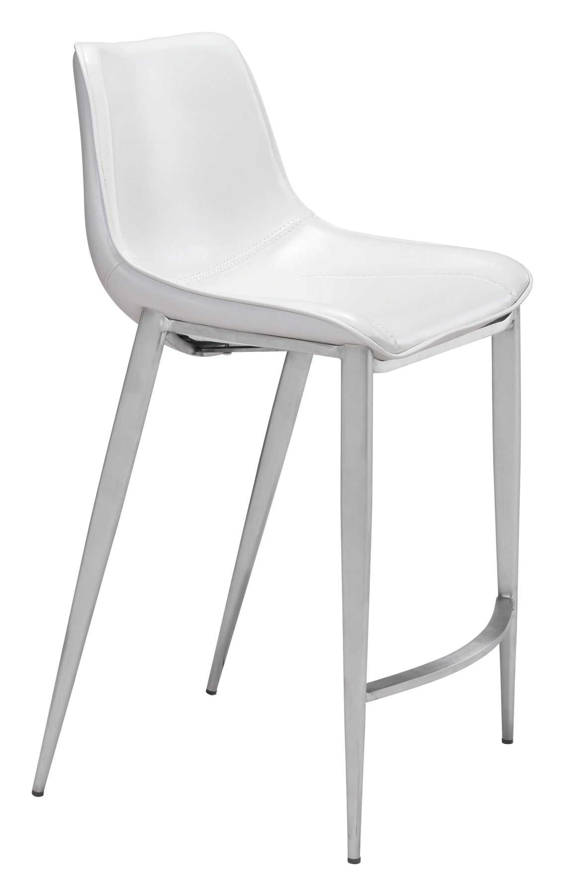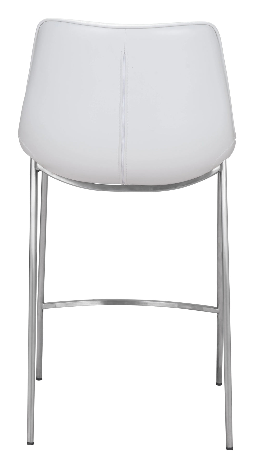 High design meets everyday casual. This handsome counter stool with its slim profile pulls up perfectly to the bar. Its super comfortable curved seat is covered in white faux leather with dramatic stitching. Brushed Stainless Steel legs are complete with protective plastic feet to keep your floors scratch-free.