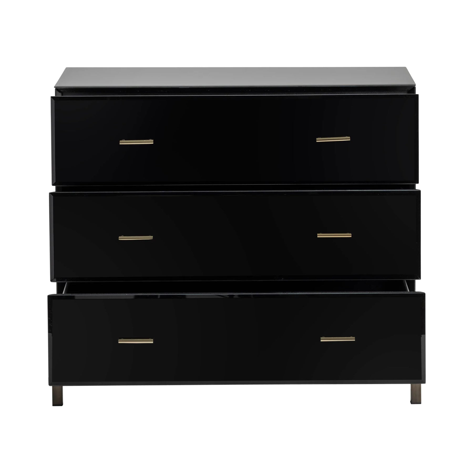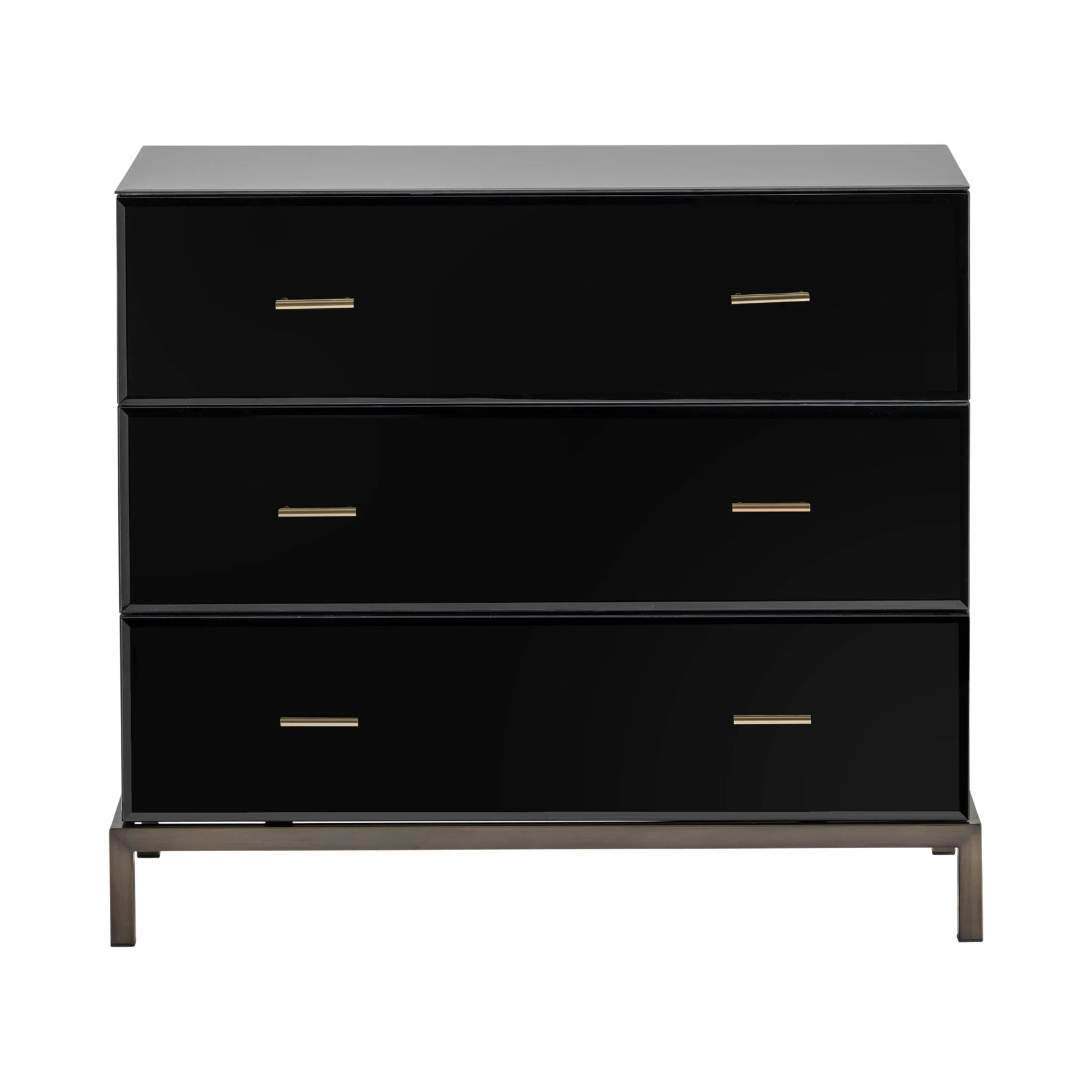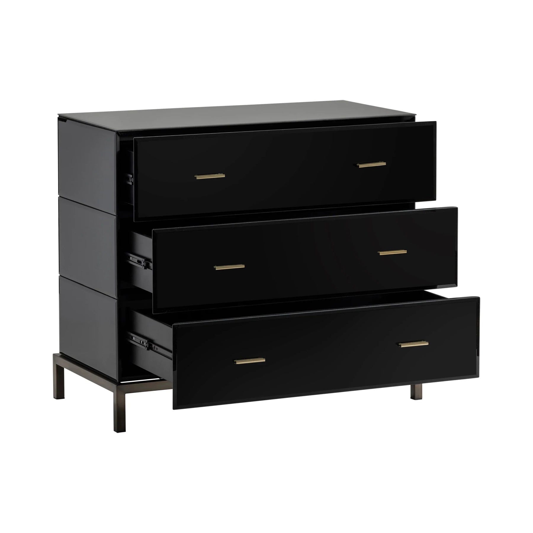 Graphic glamour defined. Jet black, high gloss fronts clad in tempered Mercury glass catch the light, while slender antique brass pulls and an iron sled base sharpen the silhouette. Add luxe, soft close storage to bedrooms, foyers or chic home offices.