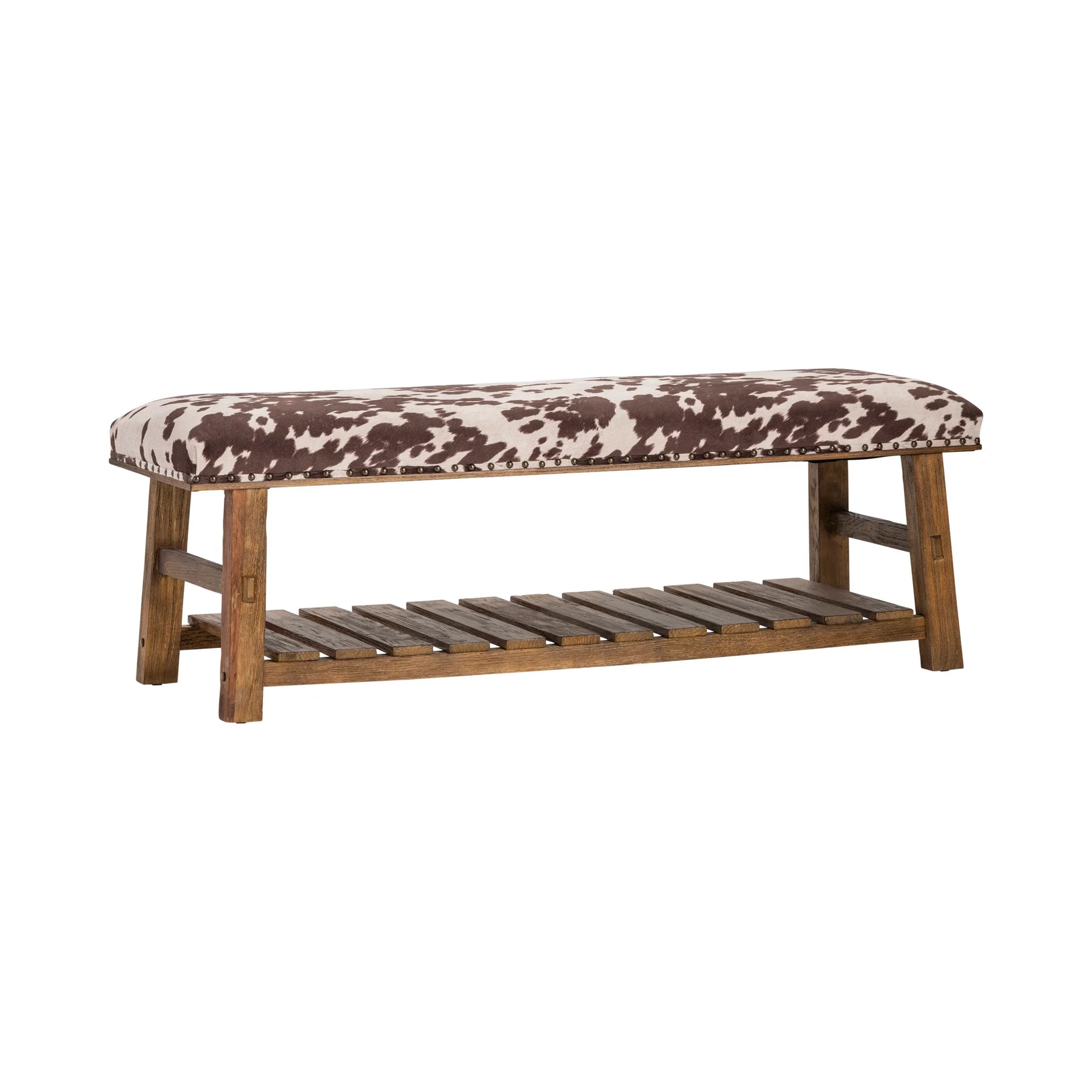 The Mesquite Ranch Bench delivers bold rustic style with a cowhide-print cushion and solid wood base. A lower slatted shelf adds functionality, making it a perfect piece for mudrooms, end-of-bed storage, or Western-themed spaces.