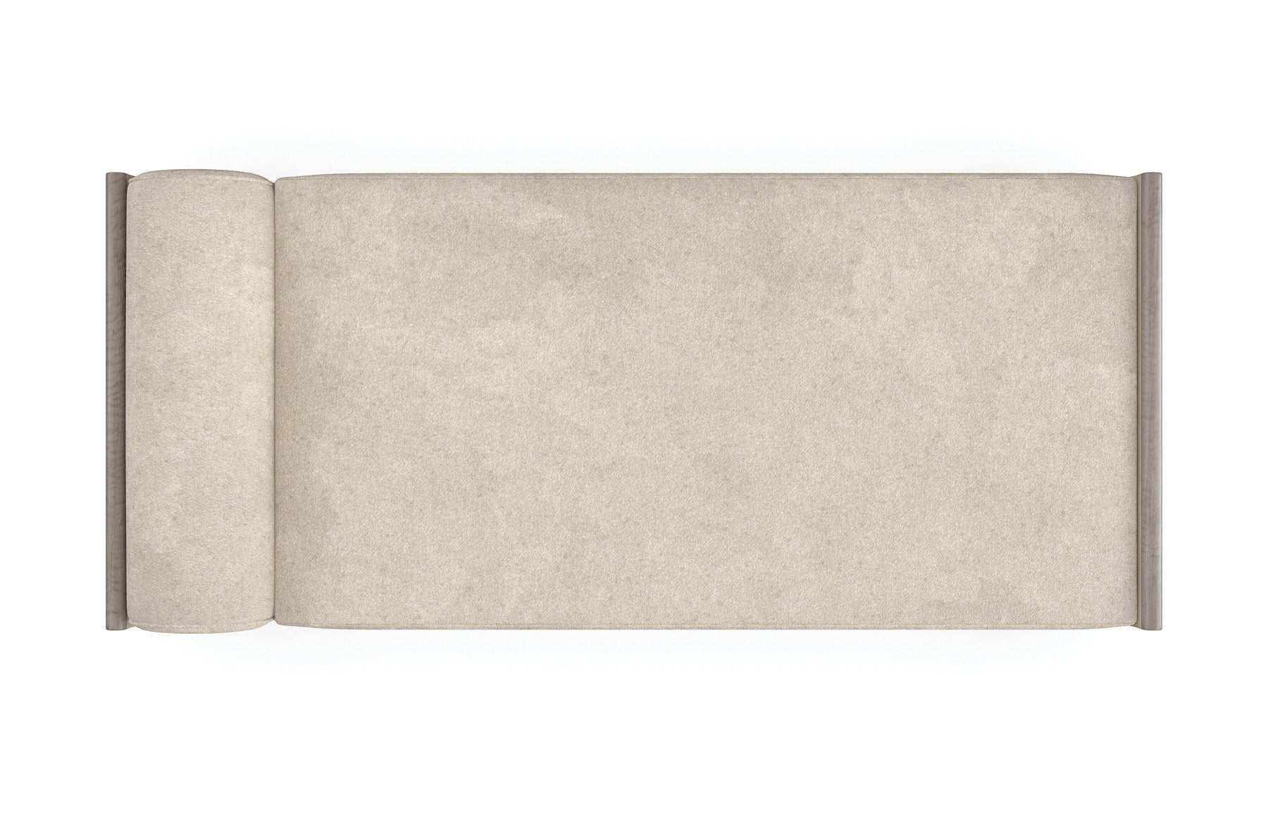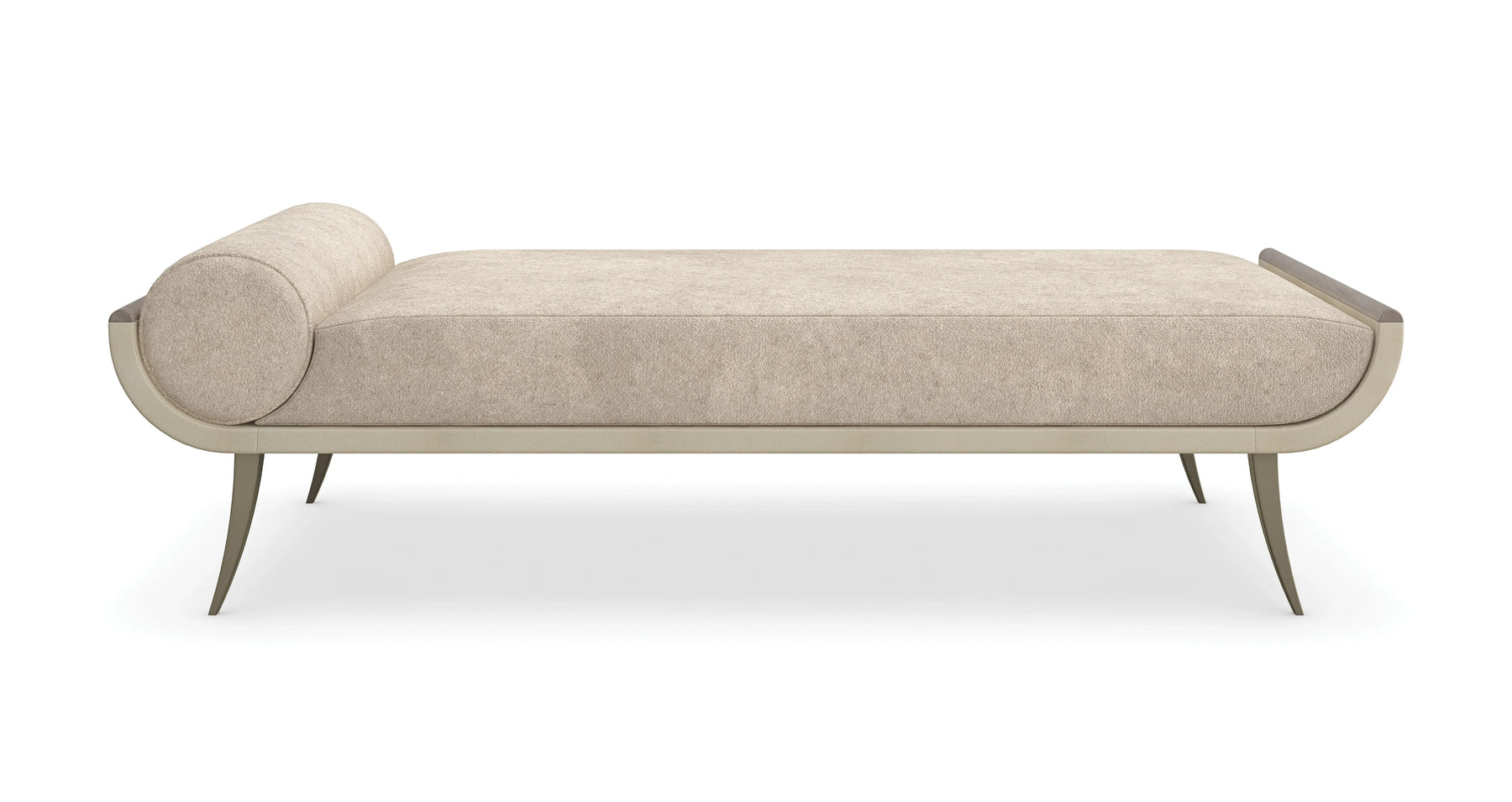 Taking inspiration from a French antique, this elegant chaise reimagines a classic silhouette in a sensuous material mix. Meticulously tailored in a luxuriously soft velvet, its elongated upholstered seat features an integrated bolster pillow, nestled within a faux shagreen-wrapped frame. Distinctive details: subtly contrasting wood caps in Mountain Smoke and metal saber legs finished in a warm Brushed Gold. Perfectly proportioned for a bedroom, landing or intimate reading nook.