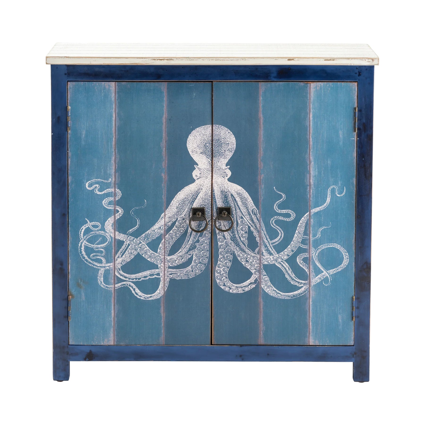 Bring coastal charm to your space with our 2-Door Wood Accent Cabinet. The deep blue frame with a charcoal wash pairs beautifully with a distressed, white-washed plank style top. Two doors, featuring a faded blue plank design and a painted octopus' motif, add a whimsical, nautical touch. Antique brass drop ring hardware enhances the vintage feel, while the internal fixed shelf offers practical storage. Adjustable levelers ensure stability, and it ships fully assembled for your convenience.