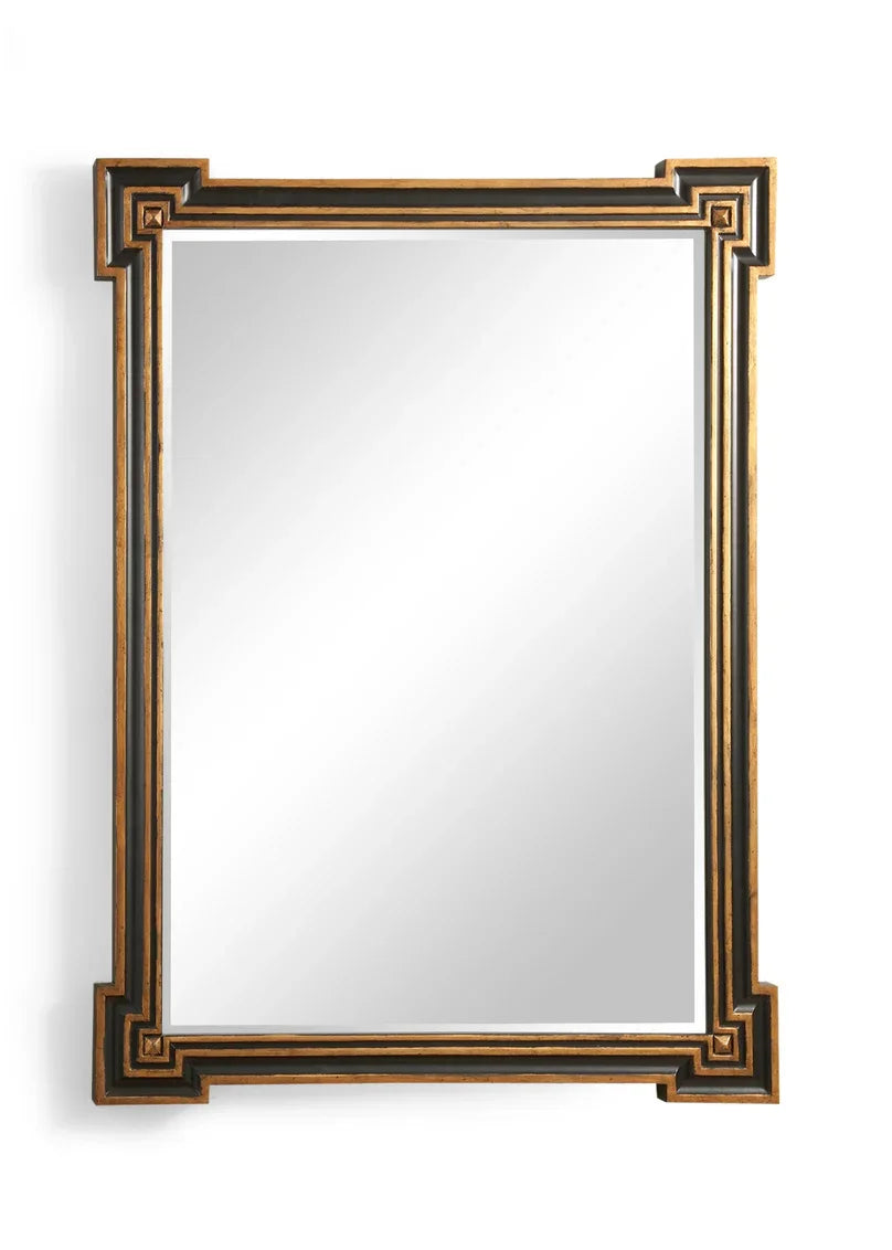 Beveled mirror with a rectangular black and gold wooden frame. Keyhole fasteners are provided for horizontal or vertical hanging.