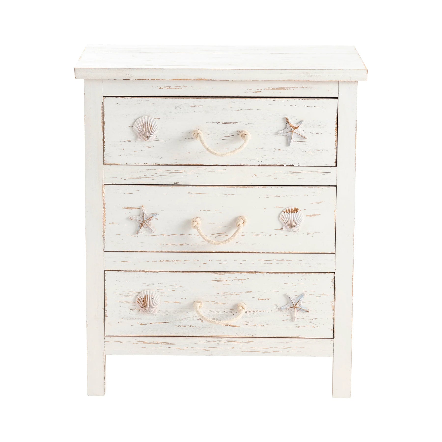 With a whitewashed finish and playful sea-inspired drawer pulls, this compact cabinet offers a lighthearted storage solution. Three drawers with unique shell and coral hardware make it a charming fit for beach houses, bathrooms, or bedrooms.