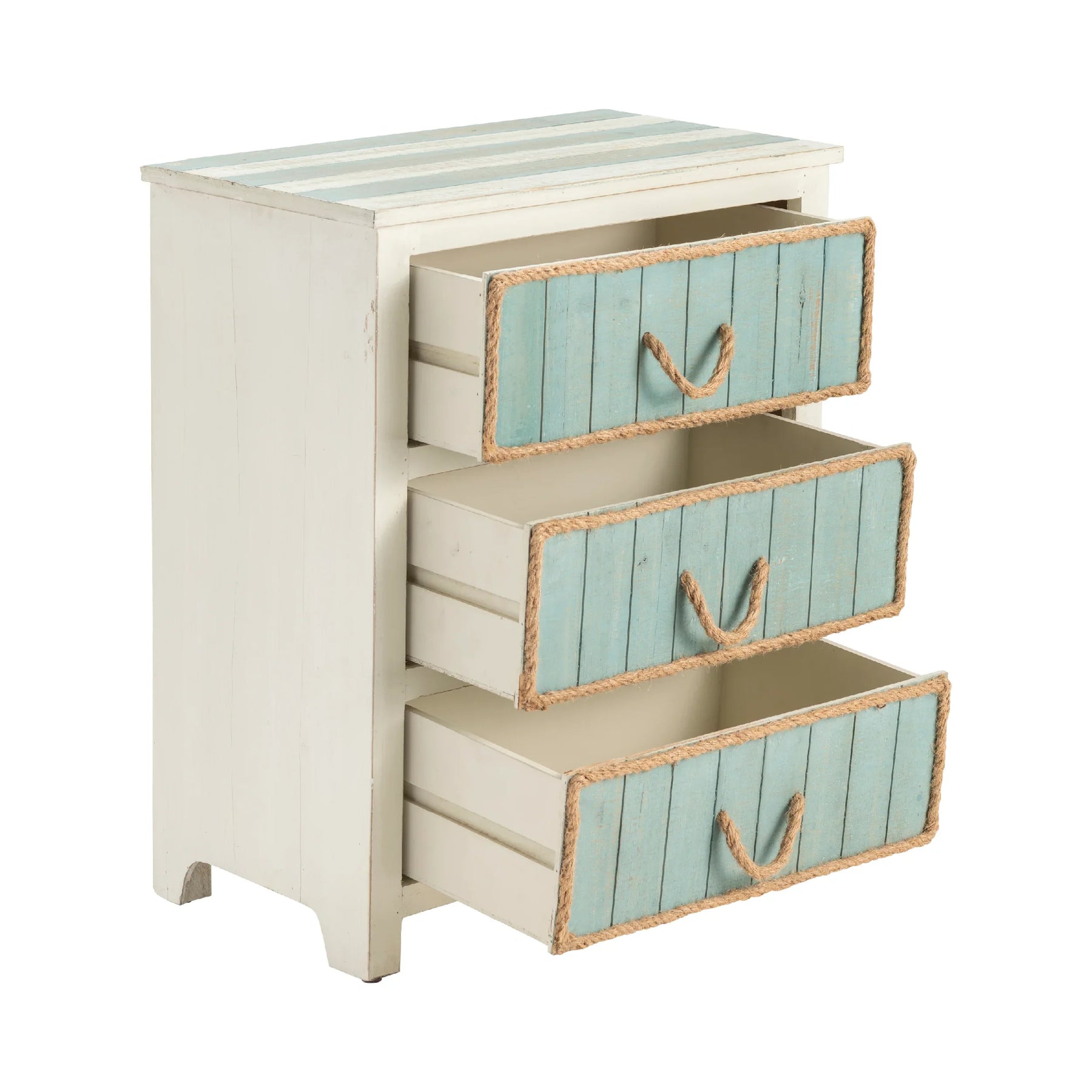 Bring coastal charm into your home with our 3-Drawer Fir Wood Accent Chest. The distressed white frame with brown undertones pairs beautifully with the distressed turquoise and white striped plank style top. Three weathered turquoise drawers, featuring a plank design, are accented with natural jute rope trim and handles for a nautical touch. Perfect for adding storage with style, this chest arrives fully assembled, ready to enhance your coastal décor effortlessly.