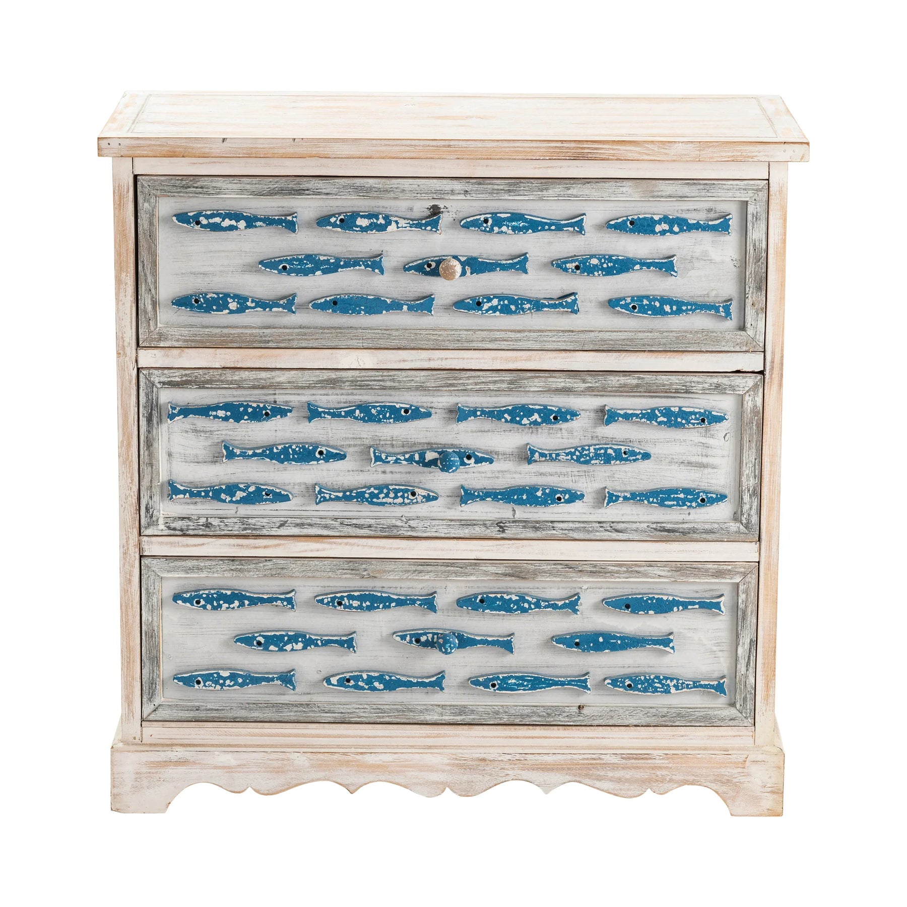 Introduce coastal charm to your home with our 3 drawer accent chest. Crafted from solid Fir wood, this piece features a white-washed frame with a brown undertone, adding an aged feel. The three drawers, equipped with metal side mount drawer slides, showcase distressed blue swimming fish accents, enhancing its coastal motif. Perfect for adding both style and storage, it ships fully assembled, ready to bring a touch of seaside relaxation to any room.