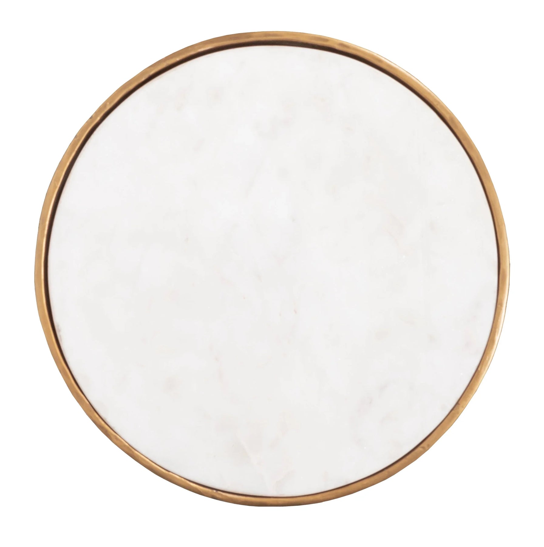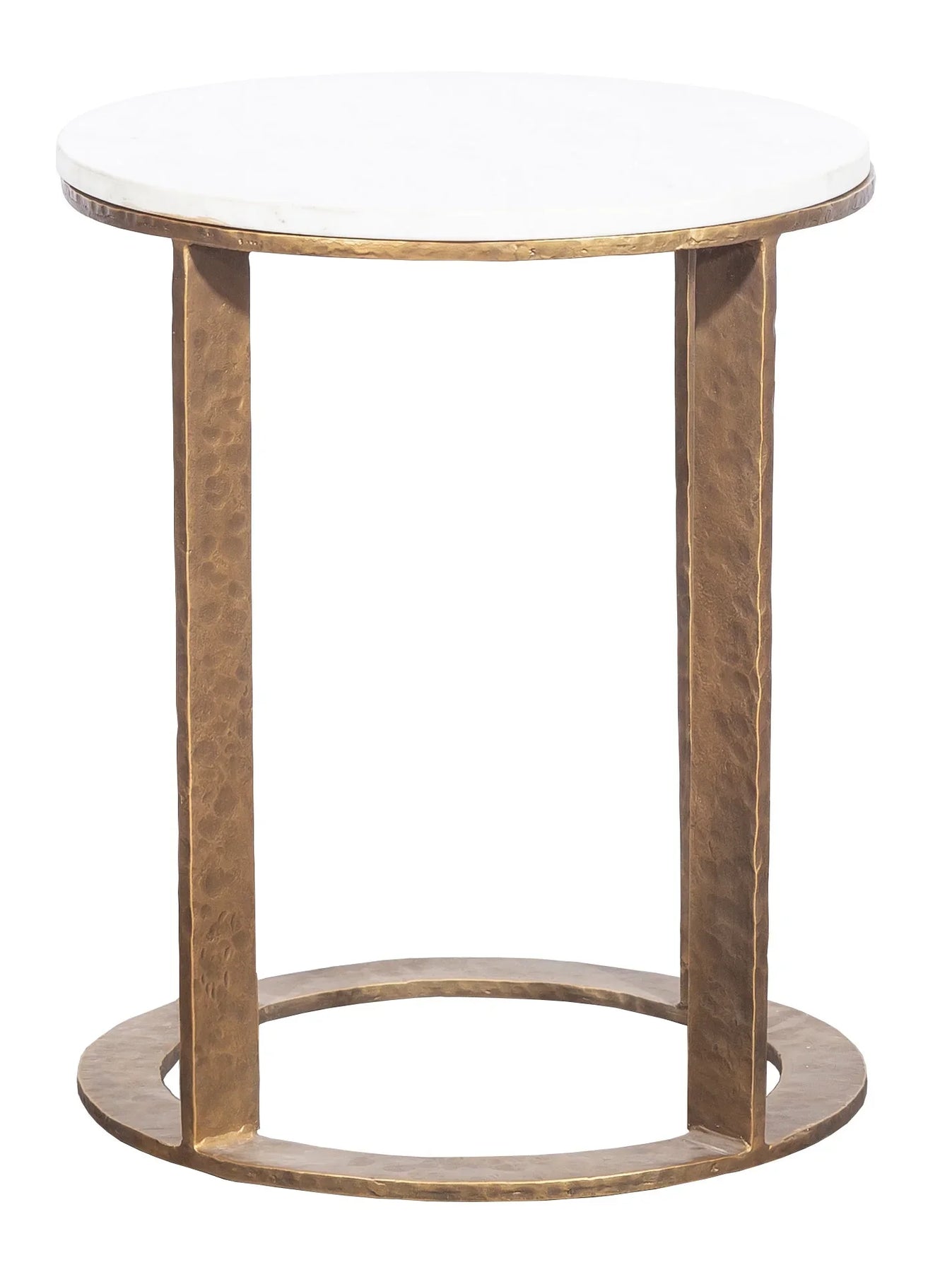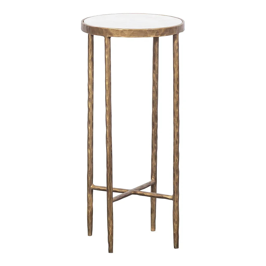 Veneto features hand-forged, hammered metal finished in a classic Antique Gold and sleek Calcutta stone tops. The elegant silhouettes, refined scale, and sleek finishes are an unexpected juxtaposition to the hammered metal execution.