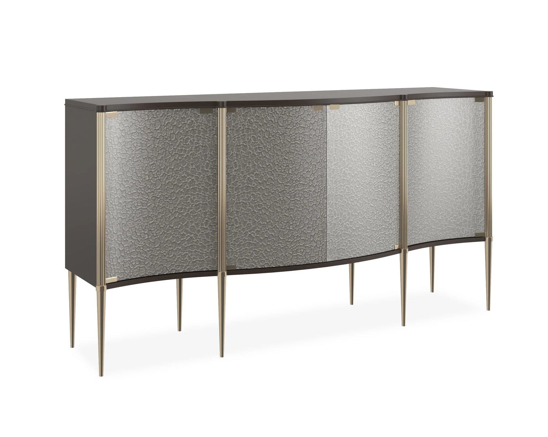 Give your room endless character by incorporating this shapely, shimmering cabinet in your design plan. Serpentine in shape, it boasts an intriguing mix of materials and features extraordinary curved glass doors crafted with a textured pattern on the inside. Metal posts and hardware finished in Zinc add contrast to its Seal Skin and Whisper of Gold exterior. Ideal in the dining room or living
