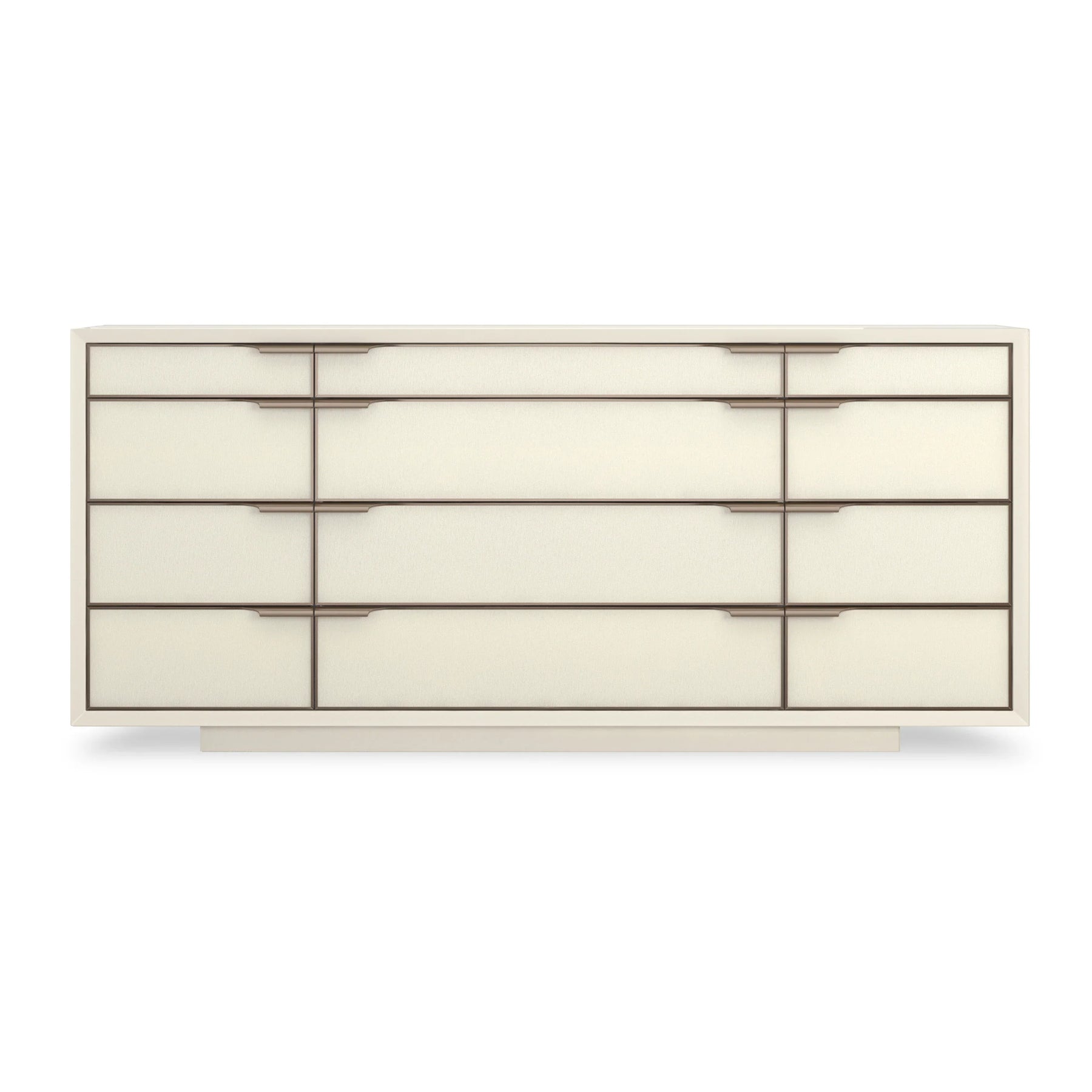 drawer trim in Champagne Gold artfully incorporates soft edge pulls. This piece offers generous storage with soft-closing features and two felt-lined top drawers for an added note of luxury.
