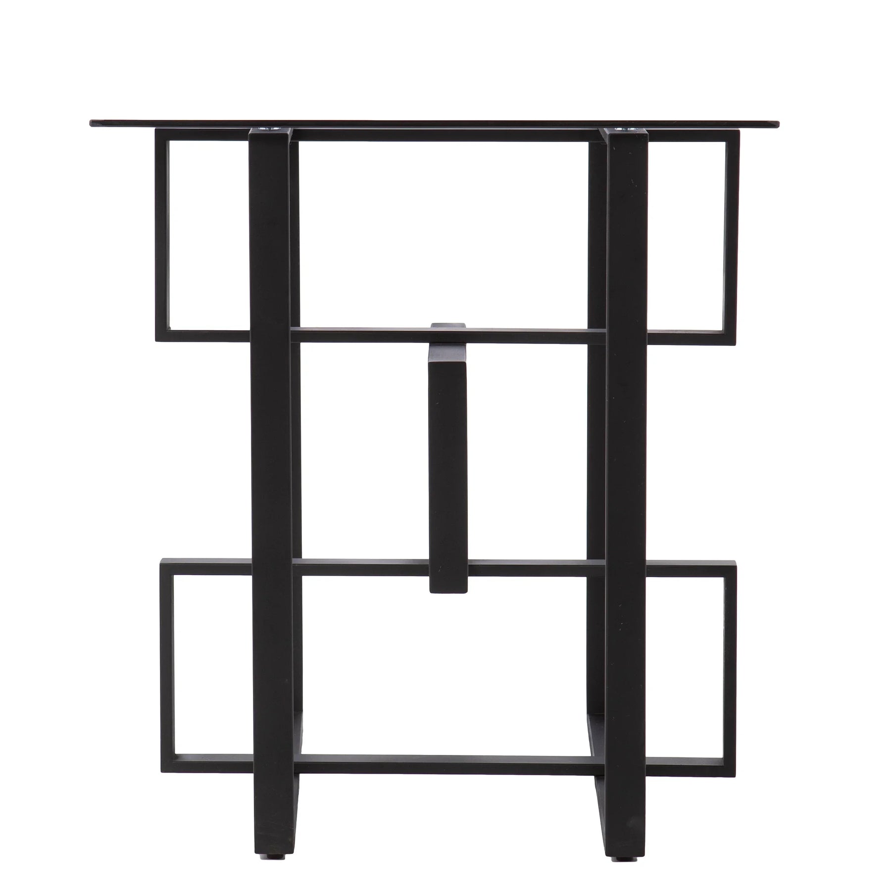 Your living space goes sleek and modern with this square side table. A gray glass tabletop easily holds a table lamp and your evening drink, while the unique metal base gives your design geometric flair. Tuck this glass-top end table alongside your family room sofa to keep your book or TV remote within reach, or station in your entryway to hold your favorite potted plant. Give your home a contemporary edge with this black accent table.