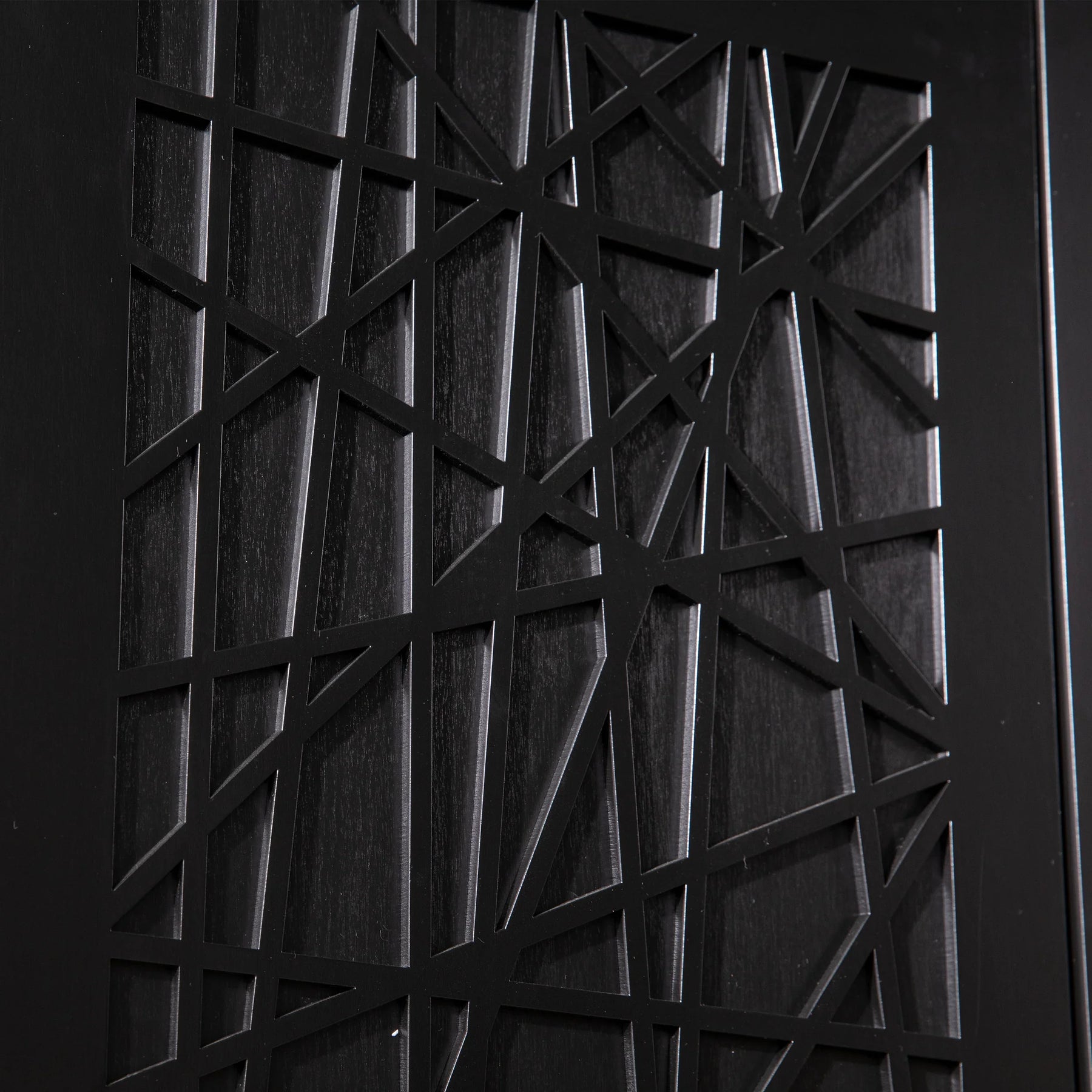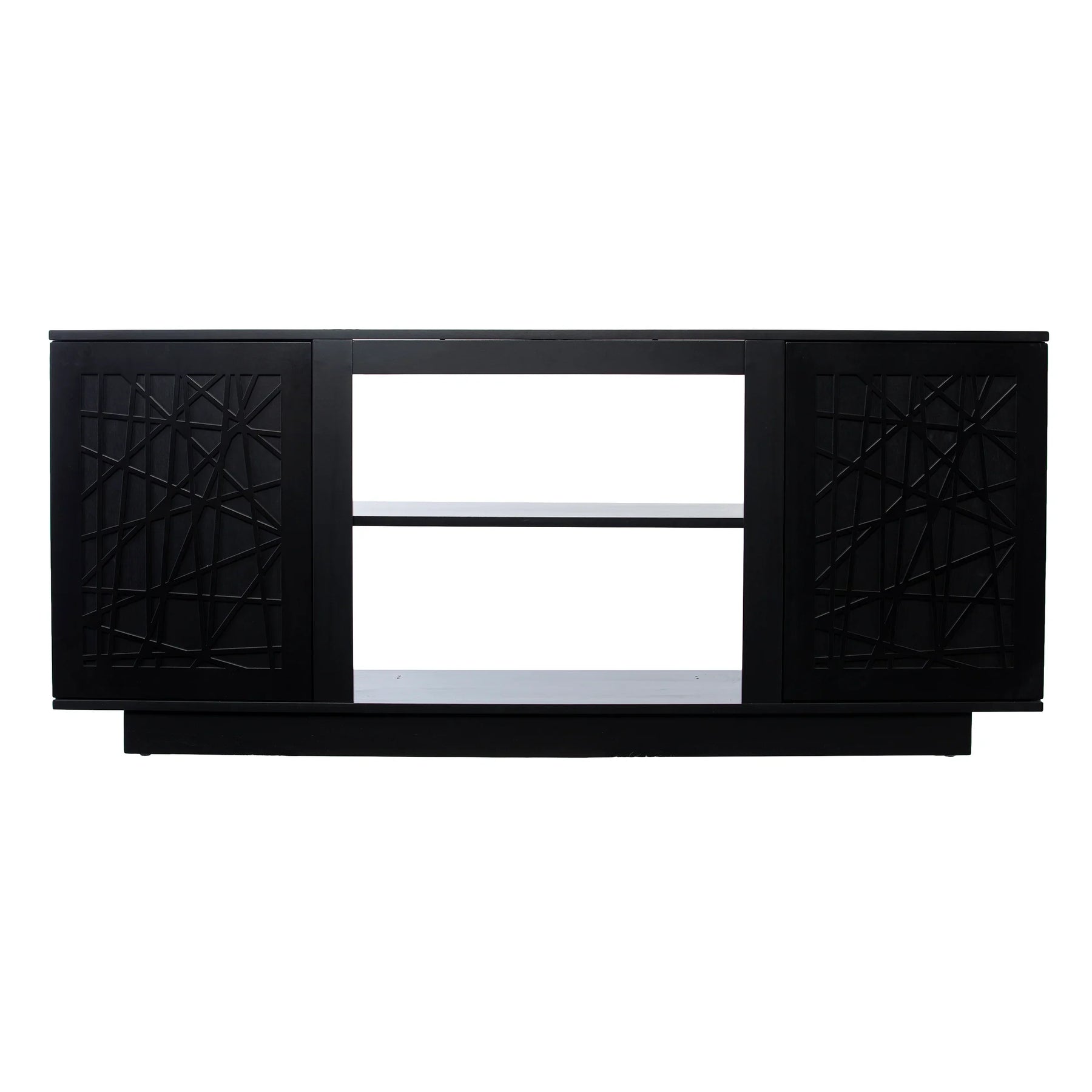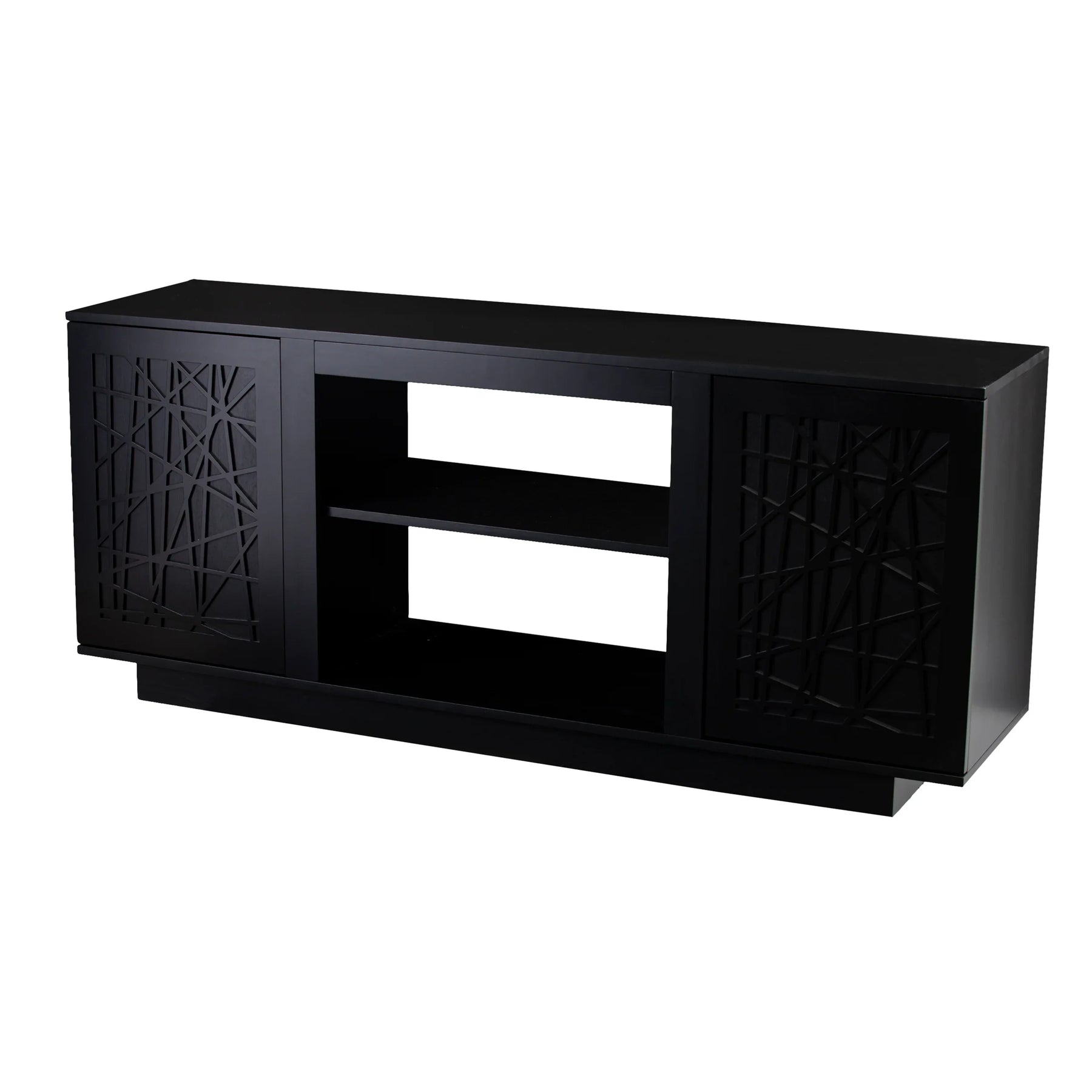 Create an entertainment oasis with this low-profile media stand. A spacious top displays décor pieces or framed photos, while textured, push-to-open doors tuck away DVDs and video games. Sleek black finish and stacked wood base craft a modern design, adding a contemporary feel to your space. Set the stage for video game sessions, movie marathons, or season finales when you add this modern media console to your living room or open concept space.