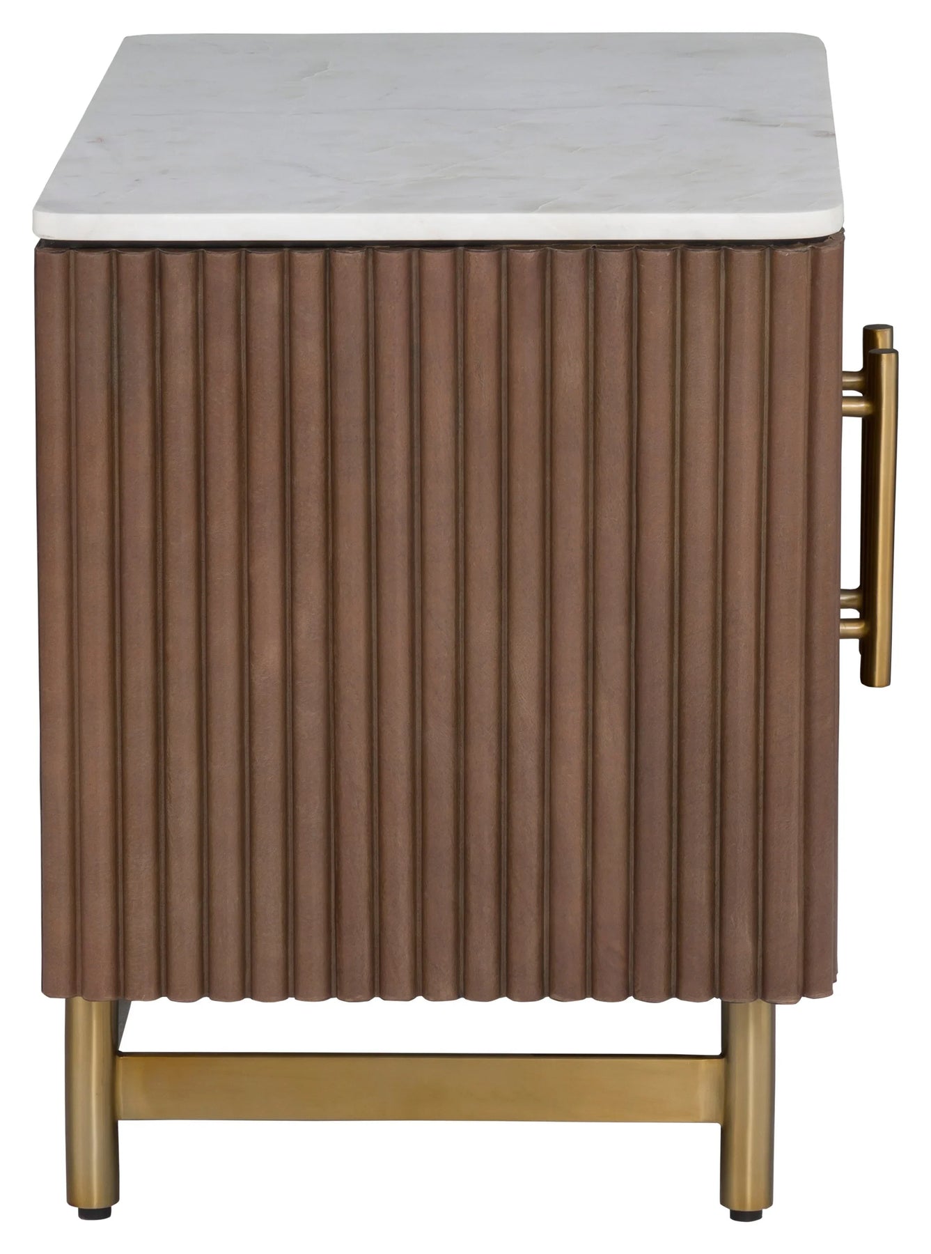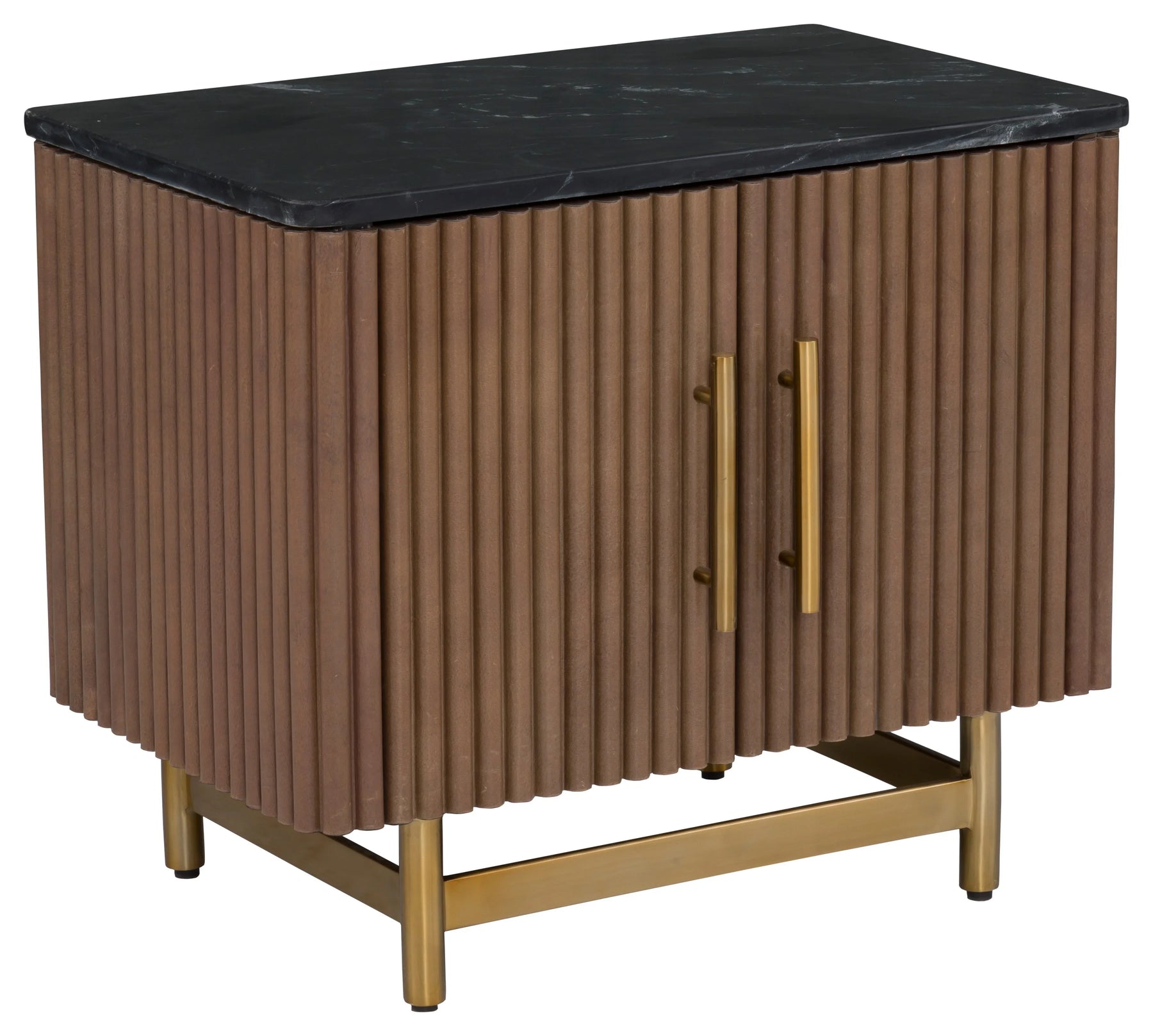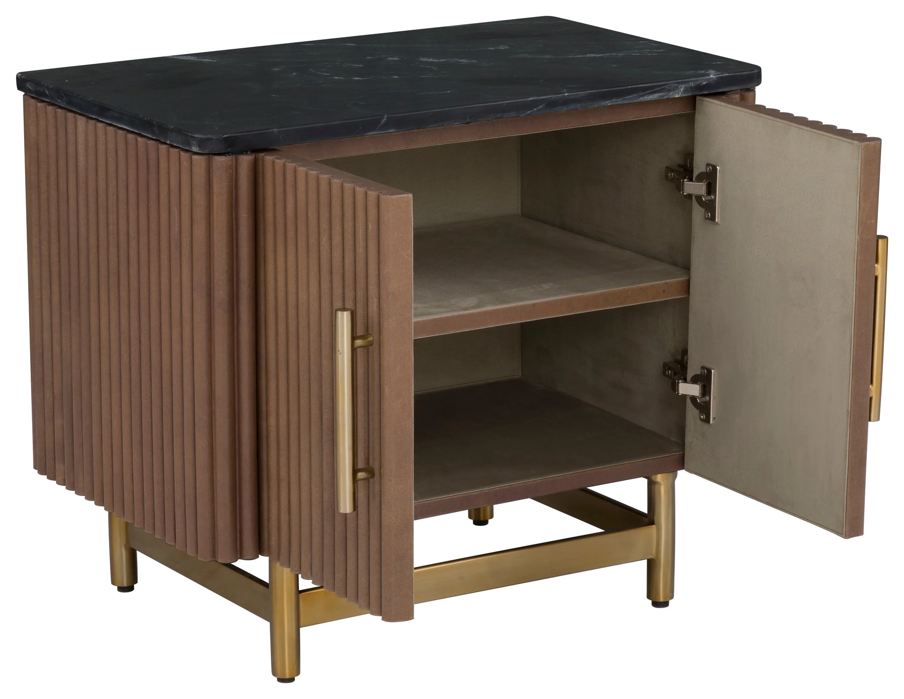Two Doors With One Adjustable Shelf. Leather Wrapped With Galaxy Black Marble Top And Aged Gold Metal Base.