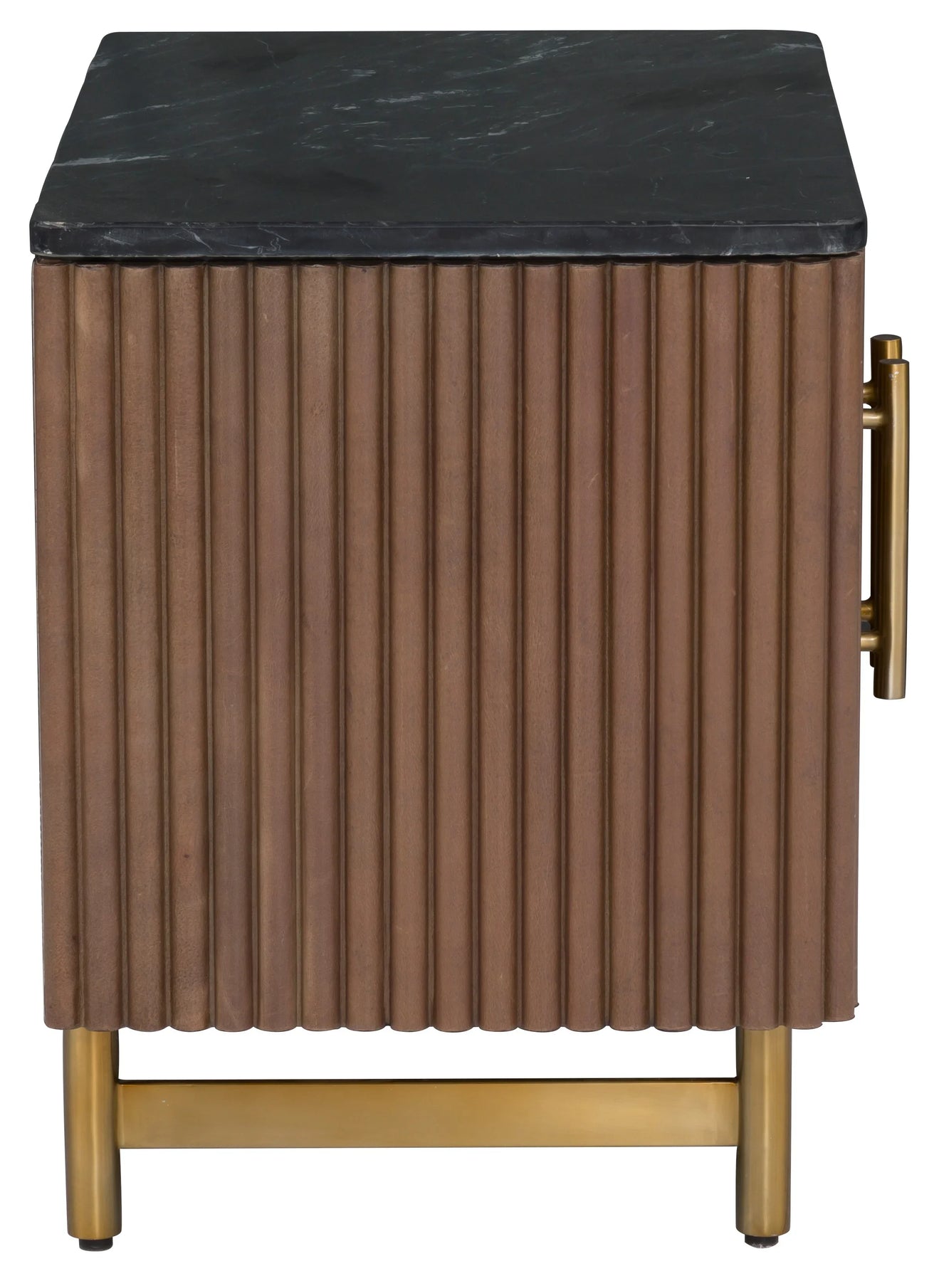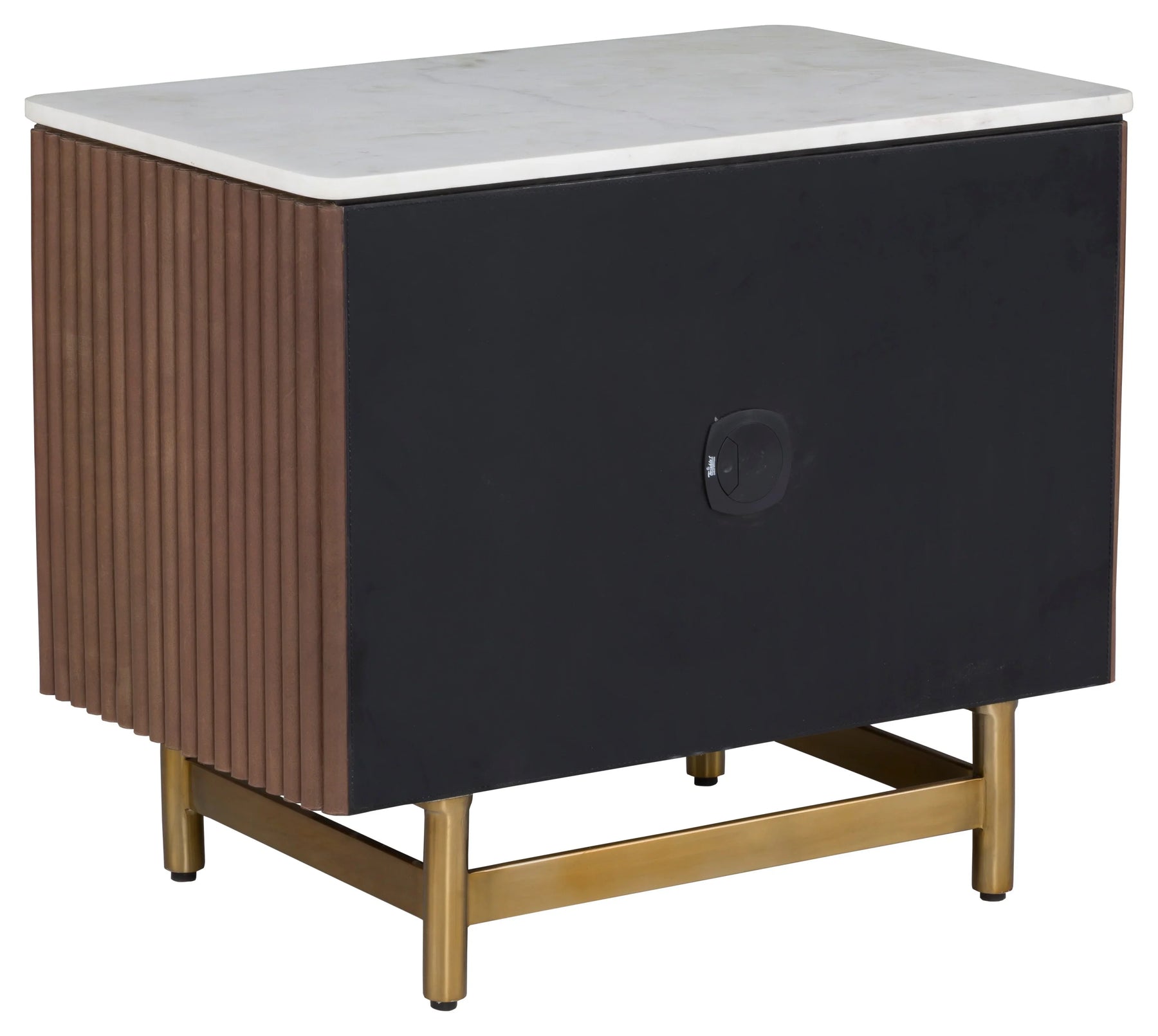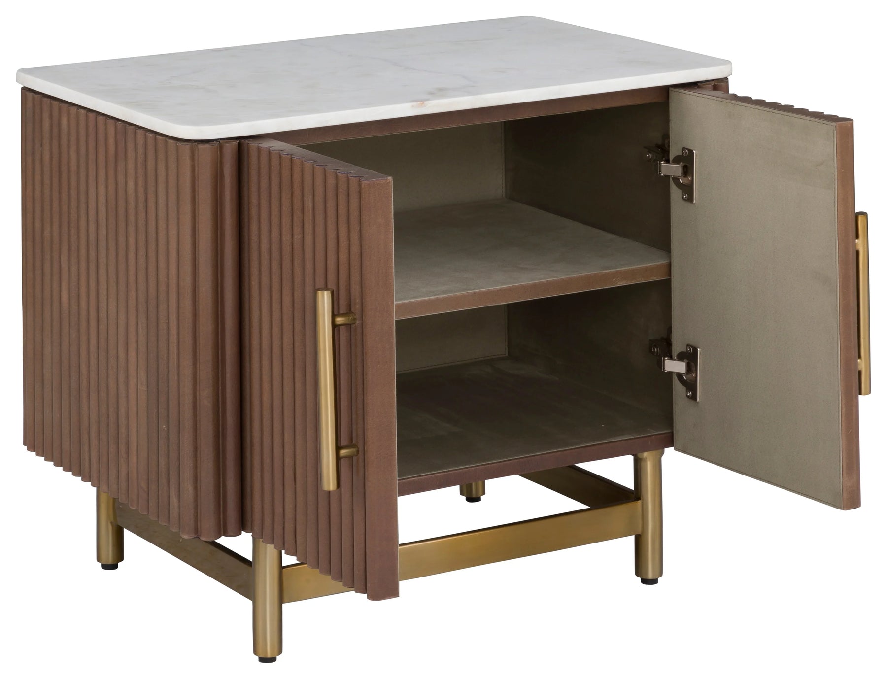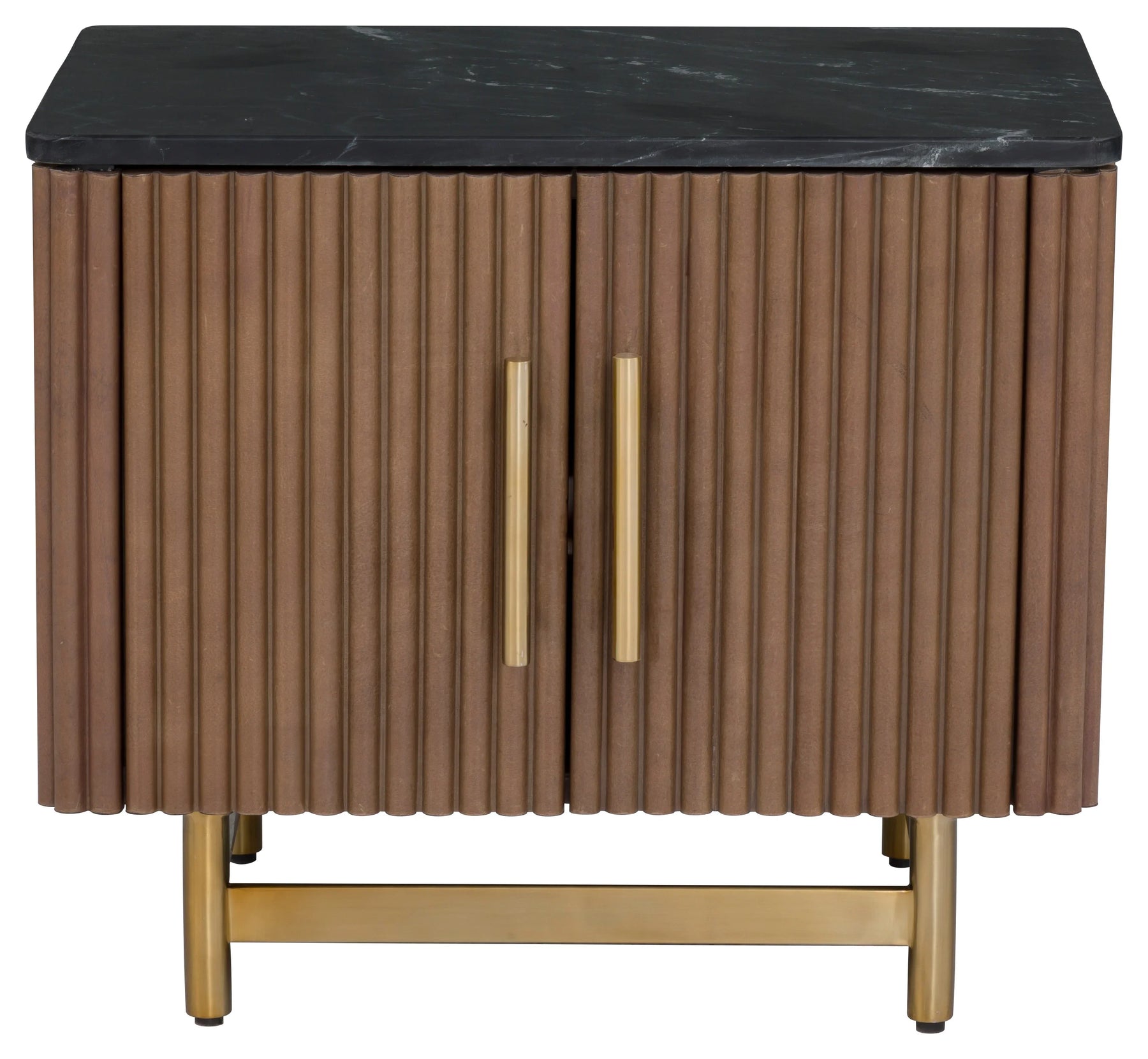 Two Doors With One Adjustable Shelf. Leather Wrapped With Galaxy Black Marble Top And Aged Gold Metal Base.