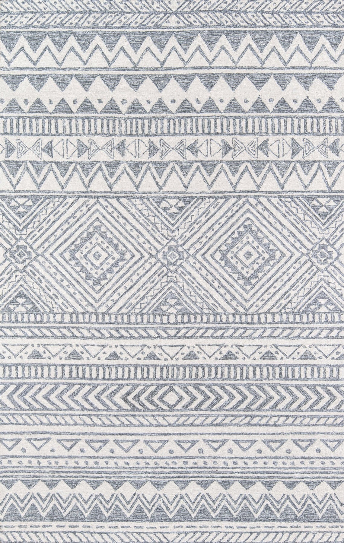 Tribal market wares meet metropolitan luxe in the global style of this traditional area rug. Diamonds, triangles and concentric linear patterns fill everchanging rows of the ethnic floorcovering that’s subtly striking in a go-everywhere gray and white color palette. The elegant ease of the hand-hooked rug design belies its sumptuous texture, its twisted wool yarns the basis for many a barefoot moment.