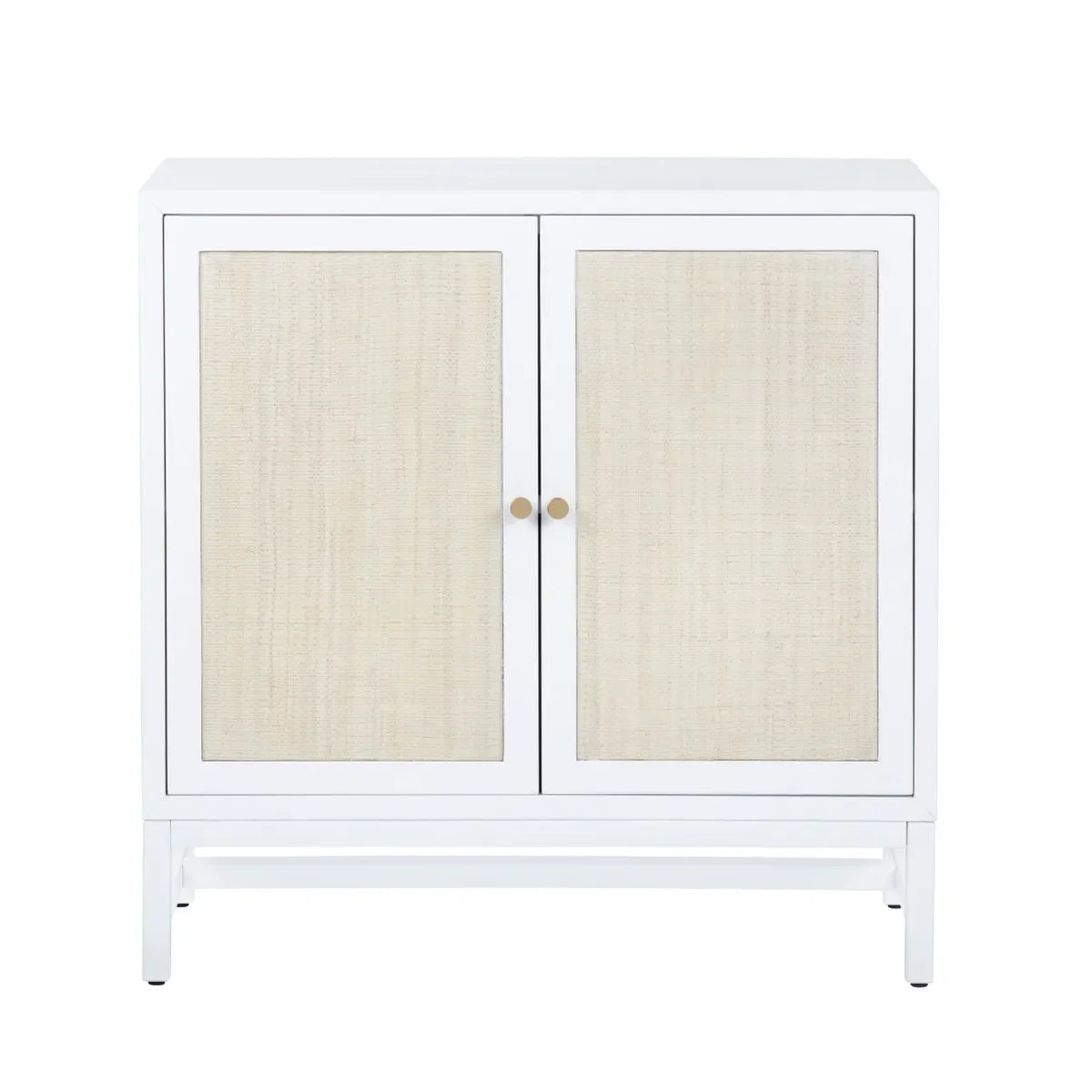 This versatile cabinet, crafted from Mindi wood and raffia, brings a sophisticated blend of texture and simplicity to any space. The white and cream color scheme features a white-washed finish, with wicker-paneled doors framed in wood for a natural, elegant touch. Inside, a white interior houses one fixed shelf for storage. Equipped with European hinges, antique brass knobs, and floor levelers for stability, assembly is simple—just add the feet. A perfect mix of style and function for your home