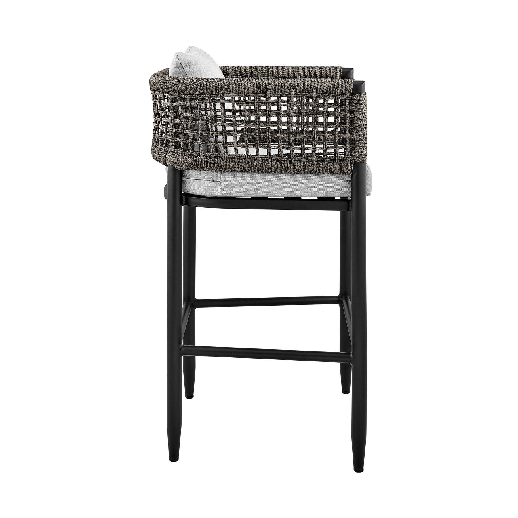 Bring outdoor furniture that exudes modern charm to your home with the Alegria Outdoor Patio Counter or Bar Stool in Aluminum with Rope and Gray Cushions from Armen Living. The modern and clean line silhouette of this outdoor chair with cushions is complimented by unique woven rope arms. The rope is treated to be protected from water, UV, oil, and fading. The lightweight aluminum frame of this outdoor stool is easily portable and features a multi-layer powder coating for further effective protection from the elements and everyday wear and tear. The light gray cushions not only feature high density foam that will allow for many hours of comfortable seating; the cushions also feature a zipper closure that allows for easy removal and cleaning! This unique piece of outdoor patio furniture offers a comfortable seat to entertain or simply enjoy your garden or backyard area. The Alegria Outdoor Patio Counter or bar stools are available to you in a 26” counter height or 30” bar height option and supports up to 250 lbs. per stool. The aluminum frame features a modern black finish, light gray cushions, and gray rope.