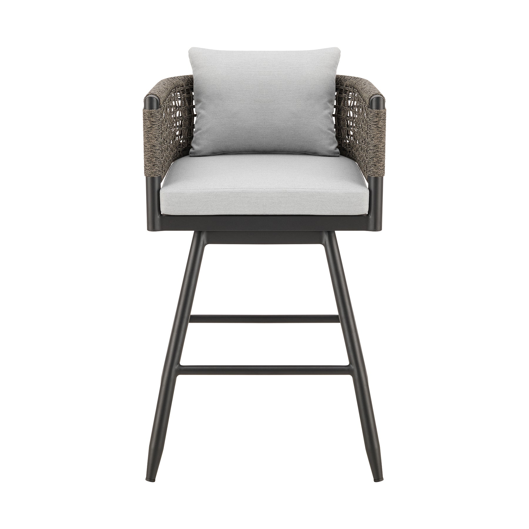 Introducing the Alegria Outdoor Patio Swivel Bar or Counter Stool – an embodiment of modern sophistication and functionality meticulously designed to elevate your outdoor entertaining space. This versatile stool seamlessly combines the sleek appeal of aluminum with the comfort of rope detailing and plush cushions, creating a contemporary and enduring piece of outdoor furniture. Crafted with precision, the Alegria Outdoor Patio Swivel Stool boasts a sturdy aluminum frame, ensuring both durability and a sleek aesthetic that complements any outdoor setting. Available in both 26-inch and 30-inch heights, this stool caters to both bar and counter heights, offering flexibility to meet your specific needs. The water-resistant and UV-resistant frame and fabric make the Alegria Stool a resilient choice for your outdoor space. Whether basking in the sun or facing unexpected rain, this stool stands as a steadfast and stylish seating solution for your patio or outdoor bar area. The inclusion of rope detailing adds a touch of texture and visual interest to the design, creating a contemporary contrast with the smooth aluminum frame. Paired with removable cushions, the Alegria Swivel Stool invites you to relax in both style and comfort, while the convenience of removable cushions facilitates easy maintenance. Whether you're sipping cocktails by the bar or enjoying a casual meal at the counter, the swivel feature of the Alegria Stool enhances mobility and social interaction, ensuring you can effortlessly engage with your surroundings. Elevate your outdoor entertaining experience with the Alegria Outdoor Patio Swivel Bar or Counter Stool in Aluminum with Gray Rope and Cushions– where contemporary elegance meets the demands of modern outdoor living.