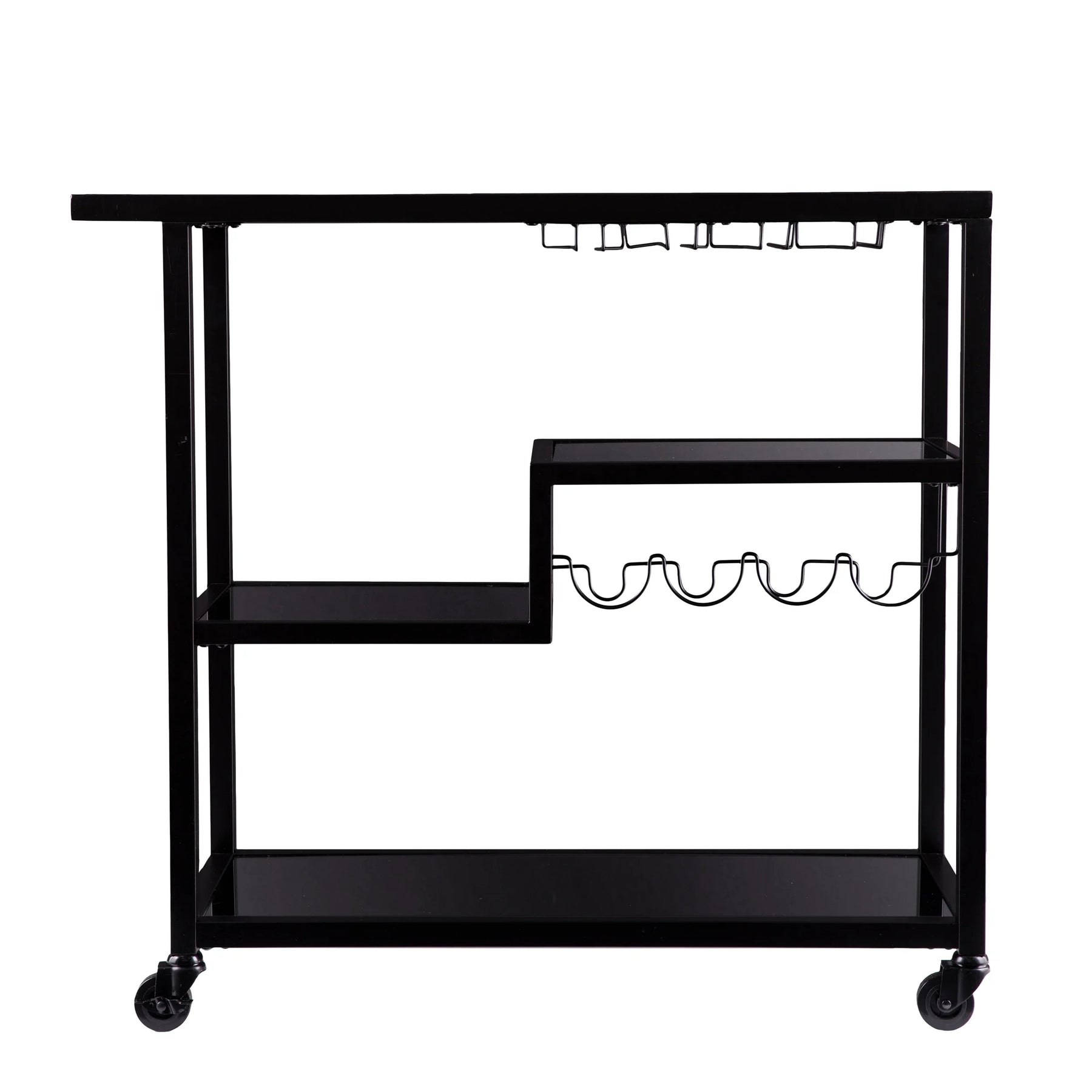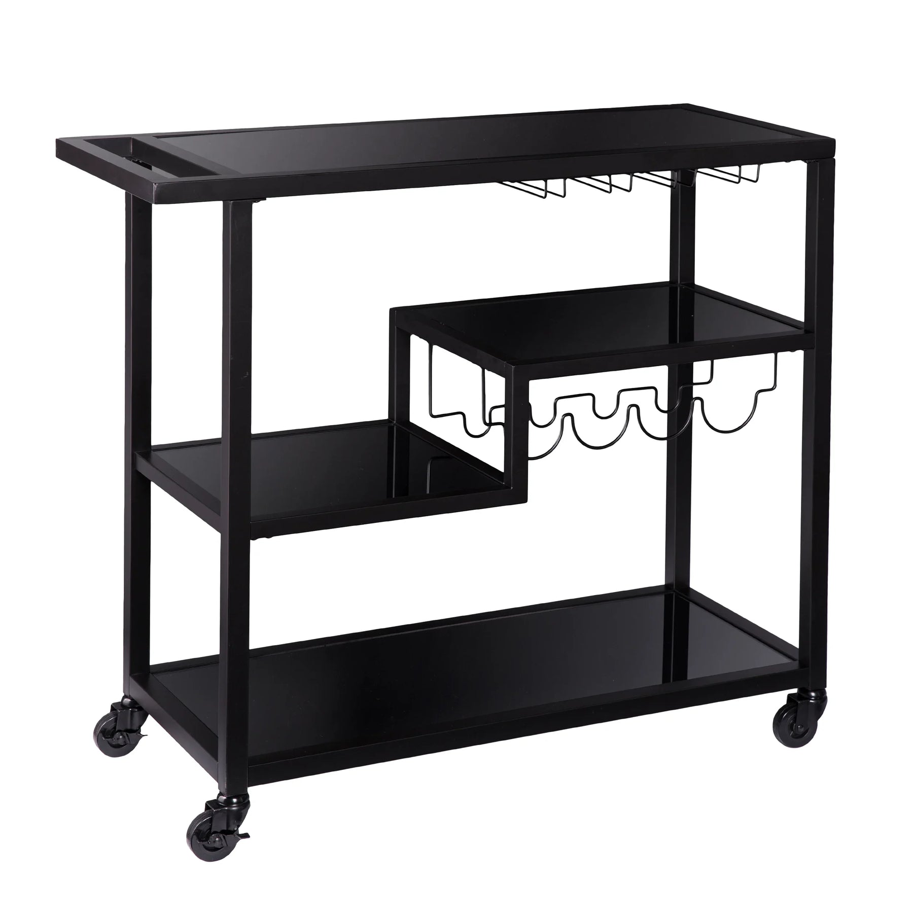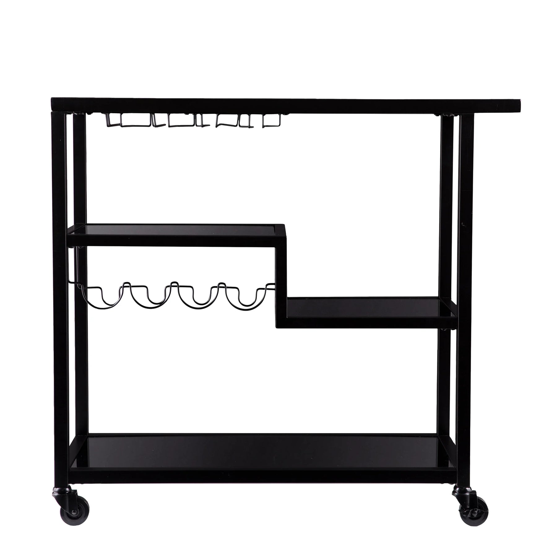 Well served. Keep the party rolling with the Zephs Bar Cart. Swanky black frames smoky gray mirror in contemporary style. Stemware racks and bottle holders keep your breakables in place, shelves handle mixers and assorted accoutrement. Casters keep you on the move or locked in position. Roll with the flow with this party wagon, or mix things up; repurpose the Zephs as a coffee and kitchen accessory center or grab-and-go foyer table.
