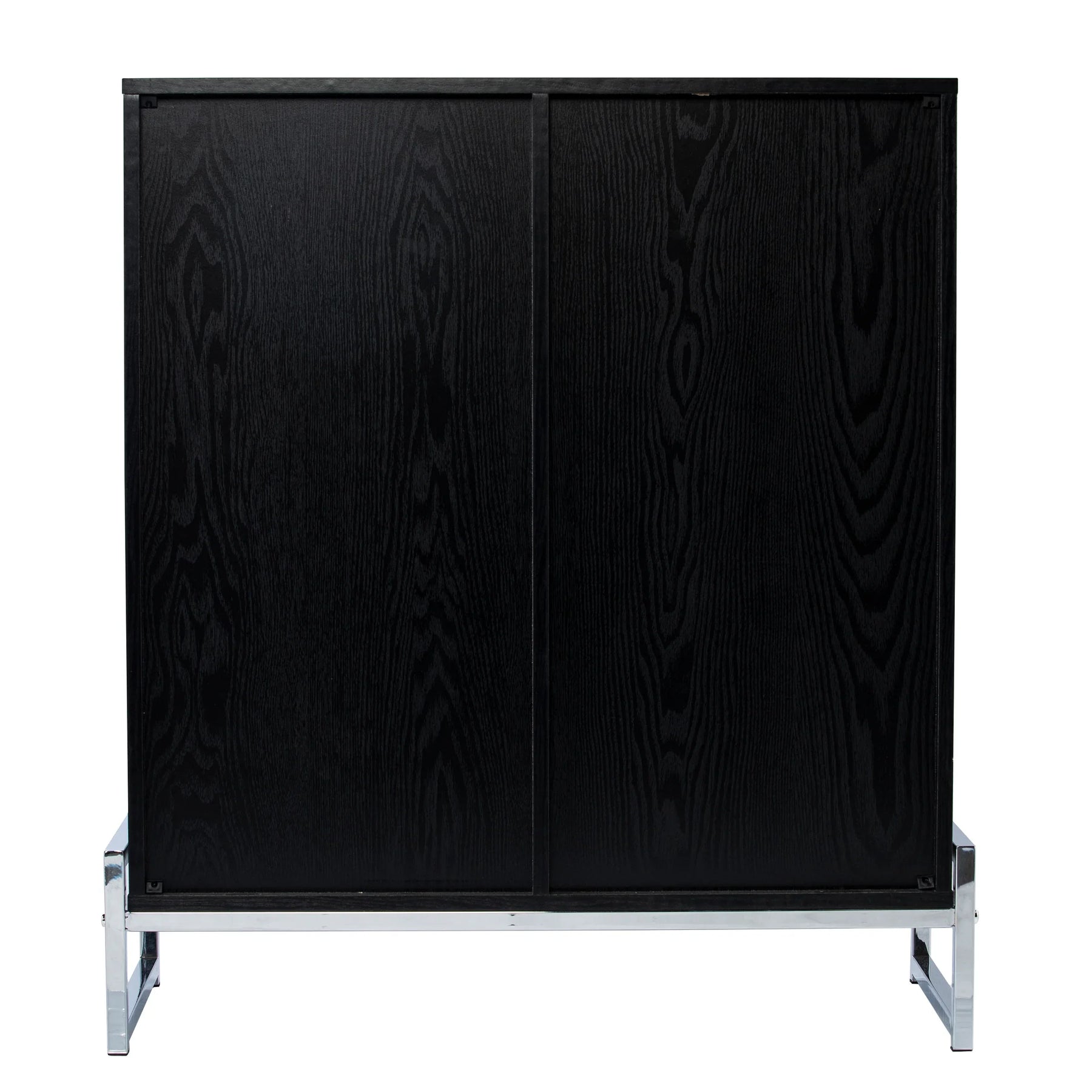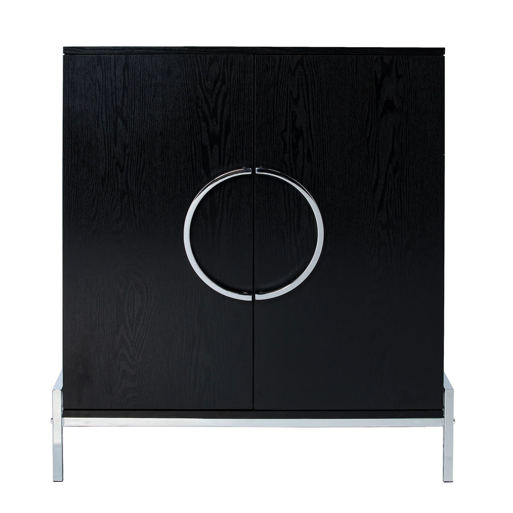 Elevate your home bar experience with this sleek double-door bar cabinet. A black finish gives your dining or living space a chic, modern feel, while chrome accents and oversized handles add a glam element to your everyday décor. Featuring six spacious shelves and a variety of glassware and bottle racks, this versatile bar cabinet works as wine storage in your formal dining area or as a multifunctional sideboard in your open concept space. Give your cocktail collection a stylish upgrade with this contemporary wine cabinet.