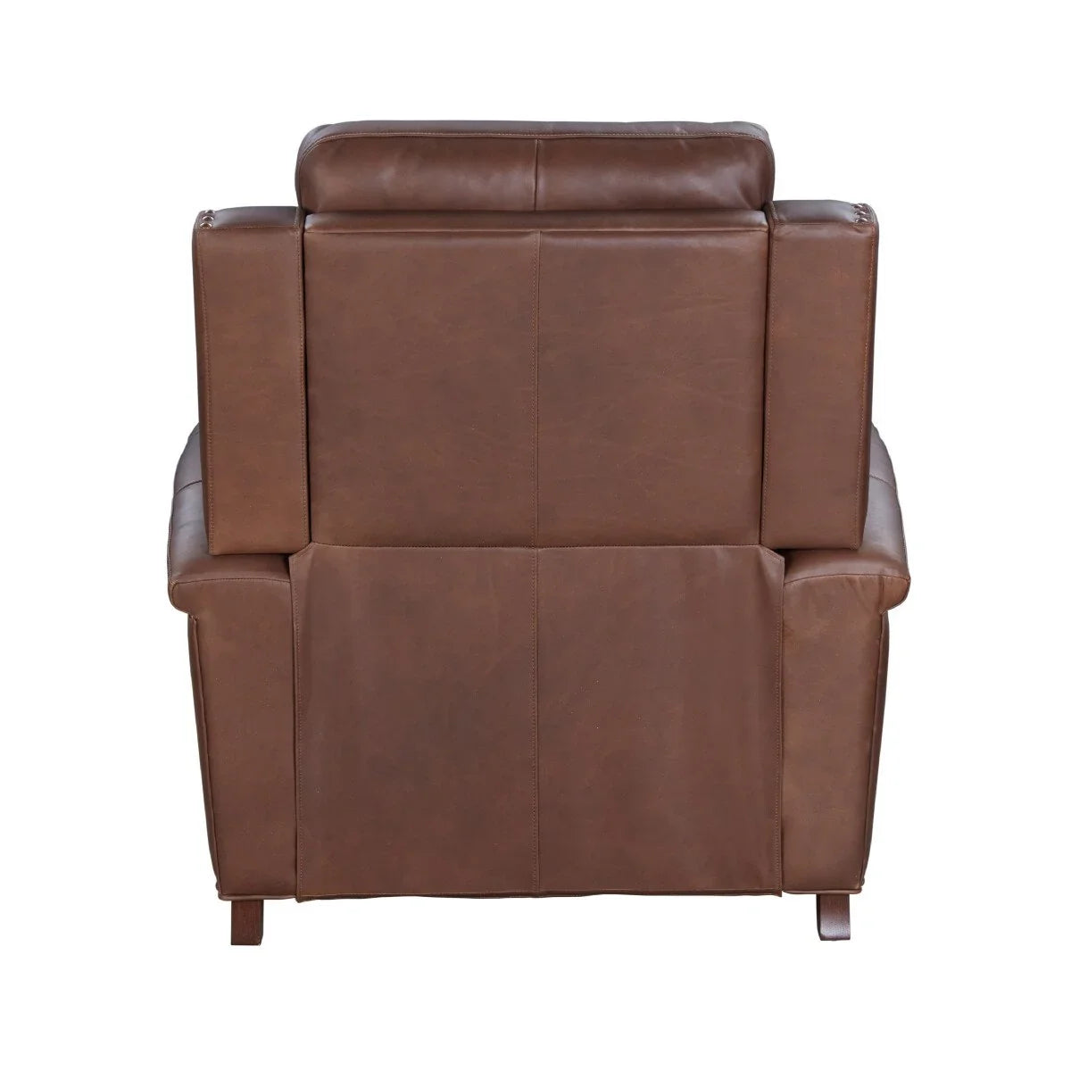 Transitional banded pillow back power recliner with power headrest, ergonomically shaped hockey stick padded arms, and boxed style pad over chaise seating with pocketed coil springs encased in foam, wrapped in Dacron, with a down blend topper. Nail head trim accents the wings, arm fronts, and bottom of the footrest/ottoman. Hand carved tapered wood legs. Inside arm controls with USB ports.