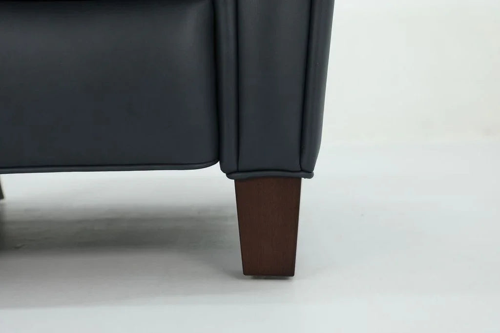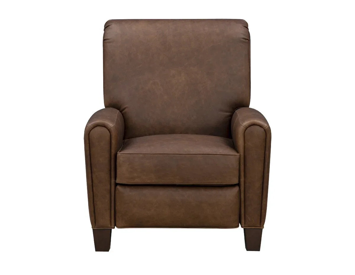 Manual push thru the arm 3-way recliner features a tight, pleated rolled back, mailbox shaped arms, loose welted box seat cushion with pocketed coil springs encased in foam, wrapped in Dacron with a down blend topper. Hand carved tapered wood legs.