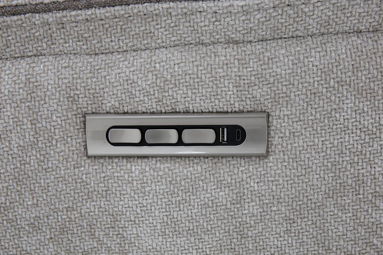 Triple power 360 degree swivel recliner with power recline, power head rest, and power lumbar. Tucked pub back, pad over chaise seat with pocketed coil springs, and steel seat box. Tailored pillow top wedge arms, contrast welts accent the back, arms and footrest. Push button power controller on outside the arm has USB A & C ports.