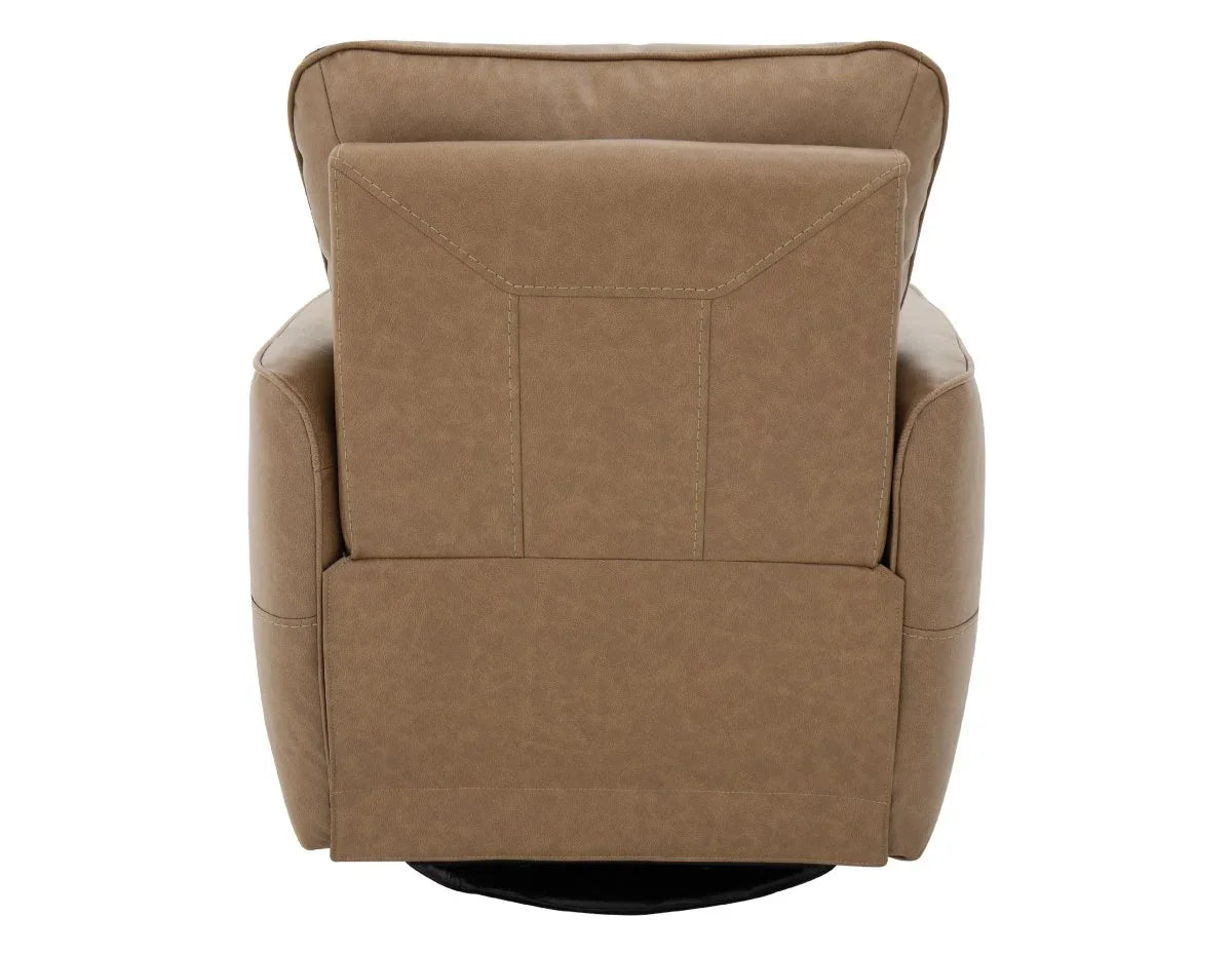 Low profile 360 degree swivel power recliner features layflat reclining mechanism, steel seat box, semi attached back cushion, box style chaise seat design which fully supports legs and eliminates pressure points. Inside the arm small round push button control