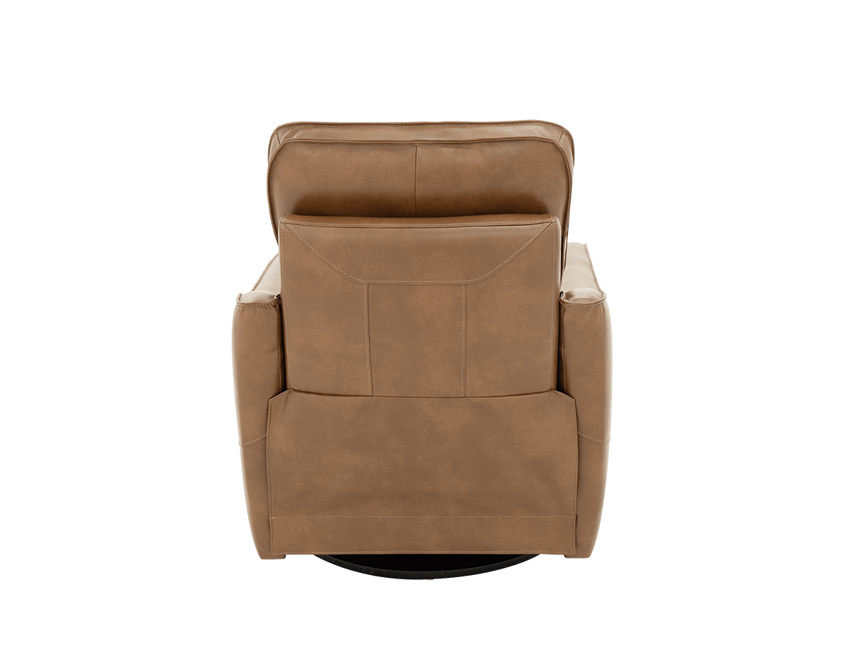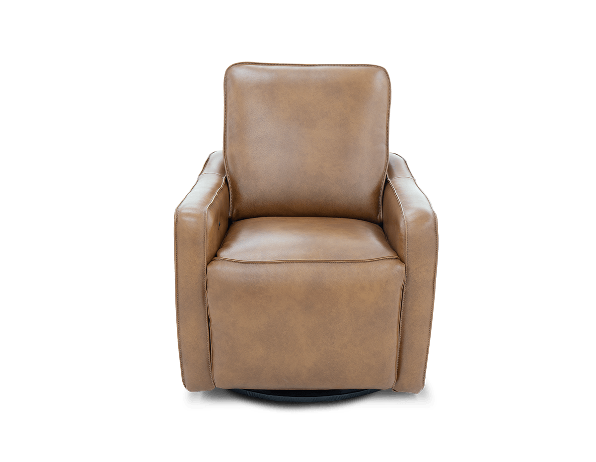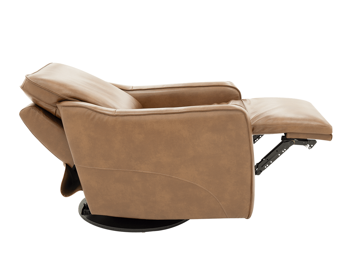 Low profile 360-degree swivel power recliner features zero wall mechanism, steel seat box, semi attached back cushion, chaise pad seat design which fully supports legs and eliminates pressure points. Inside the arm small round push button control.