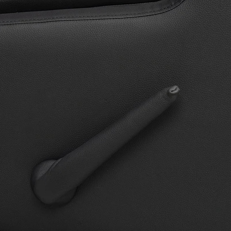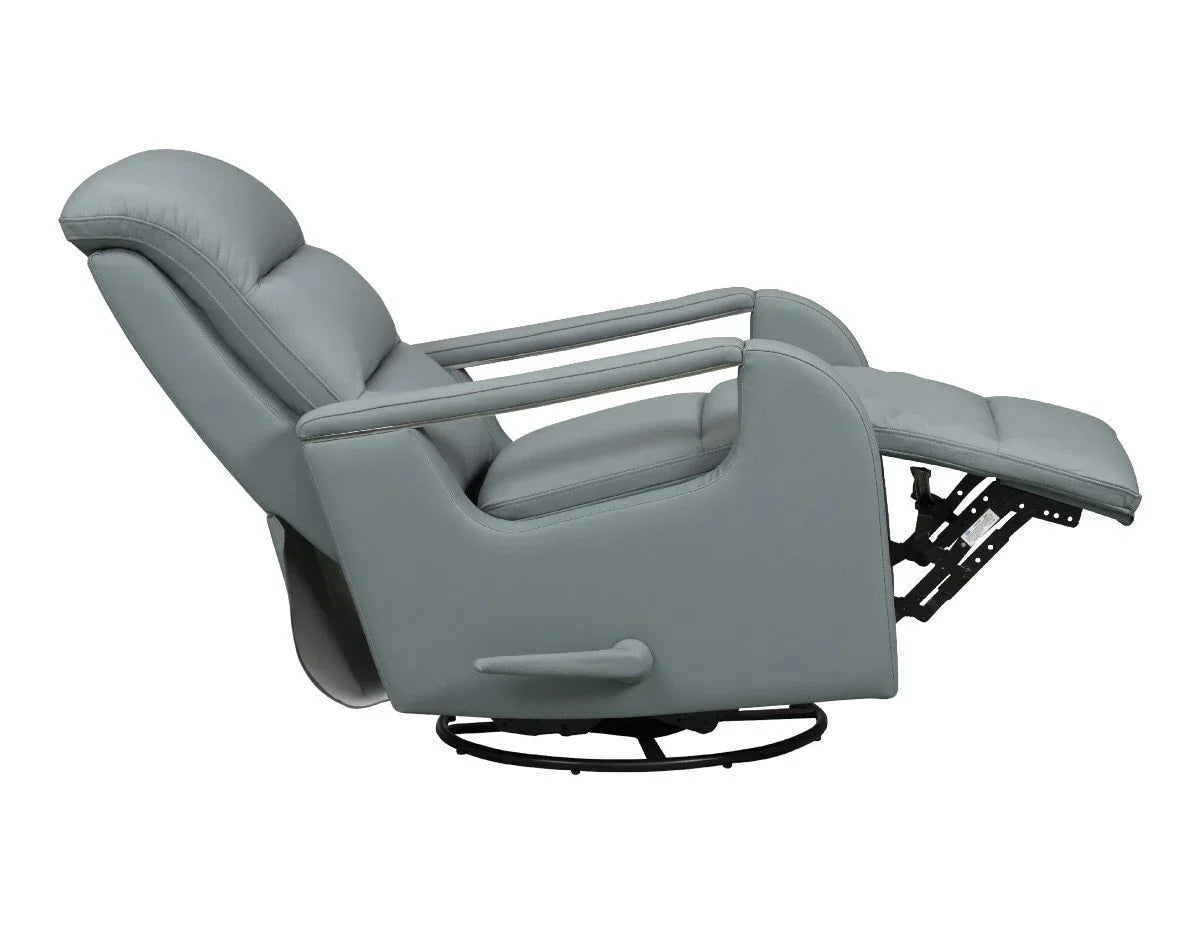 Smaller scale, manual handle activated 360-degree swivel glider recliner. Features 3 sectioned tucked tiered back, radius shaped open design arms with chrome accents, slim line arm pads and impeccable tailoring. Pad over chaise seating has pocketed coil springs encased in foam and wrapped in Dacron.