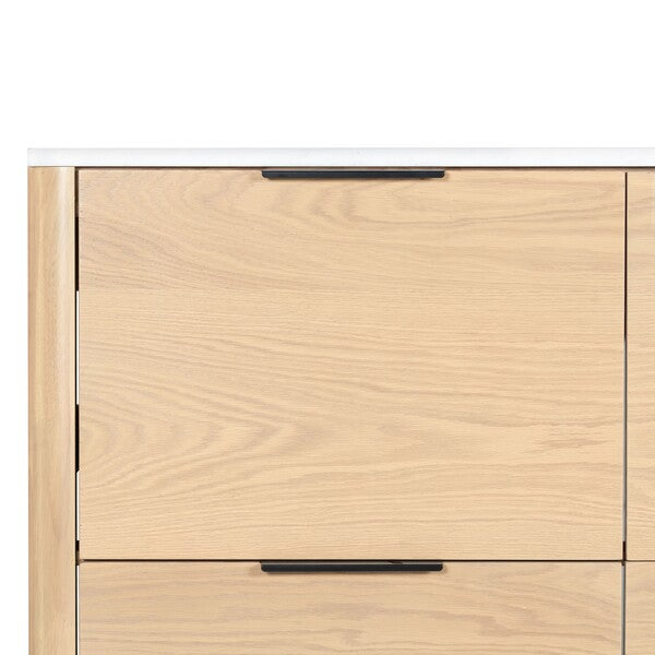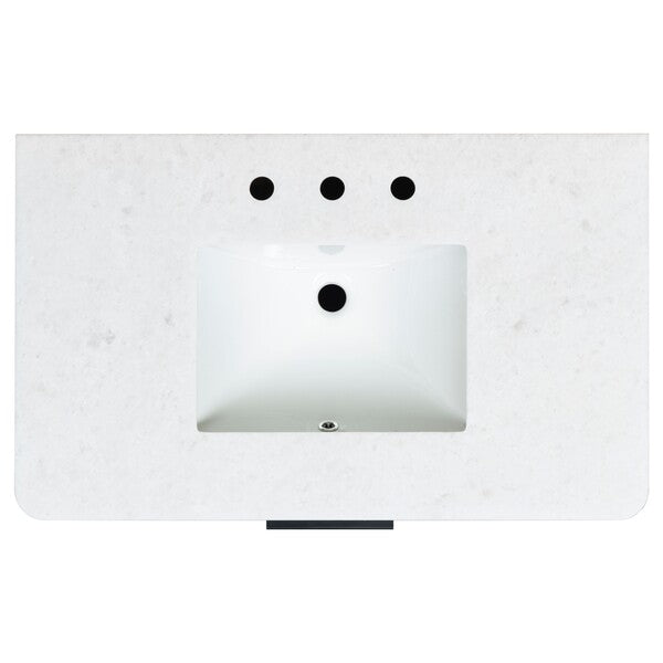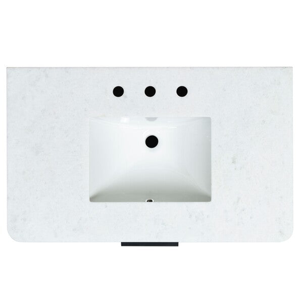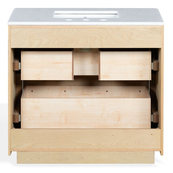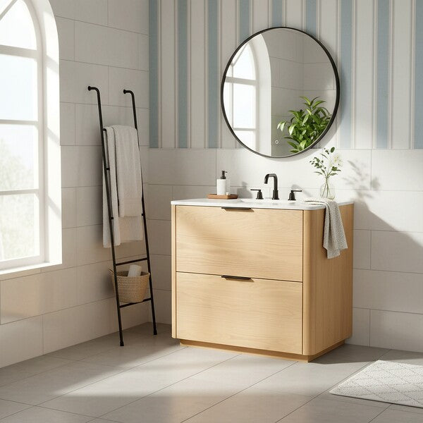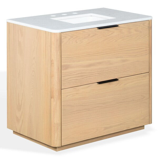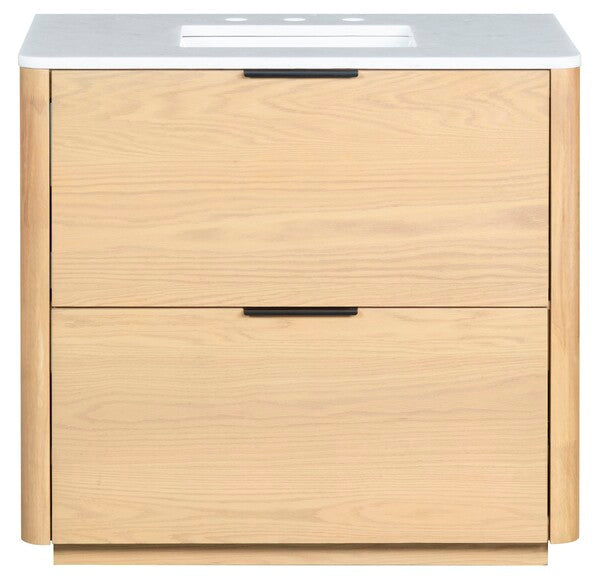 Introducing the Gabrietta 36 inch Single Vanity in Medium Oak with White accents. Transform your bathroom space with this exquisite piece that combines timeless design and practical functionality. Crafted from a blend of wood and metal, this vanity offers a robust structure that supports a sleek marble countertop, providing an elegant touch to your decor. The ceramic sink completes the ensemble with its smooth, clean finish, ensuring effortless maintenance and a polished aesthetic.