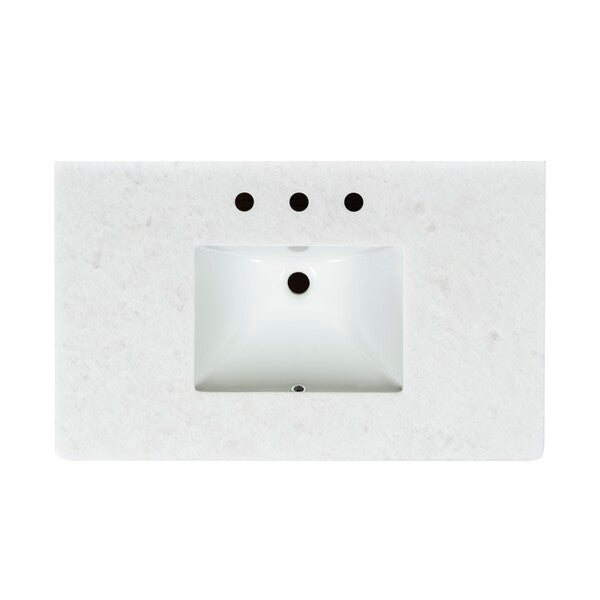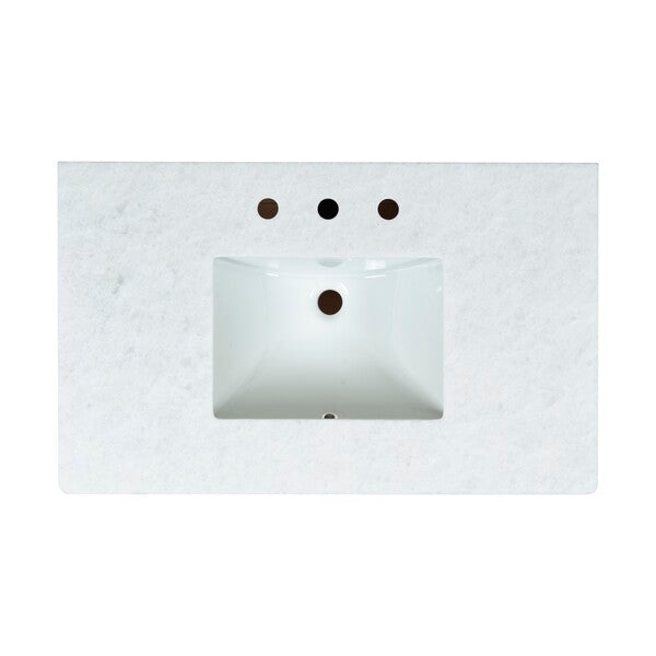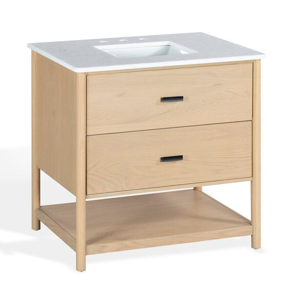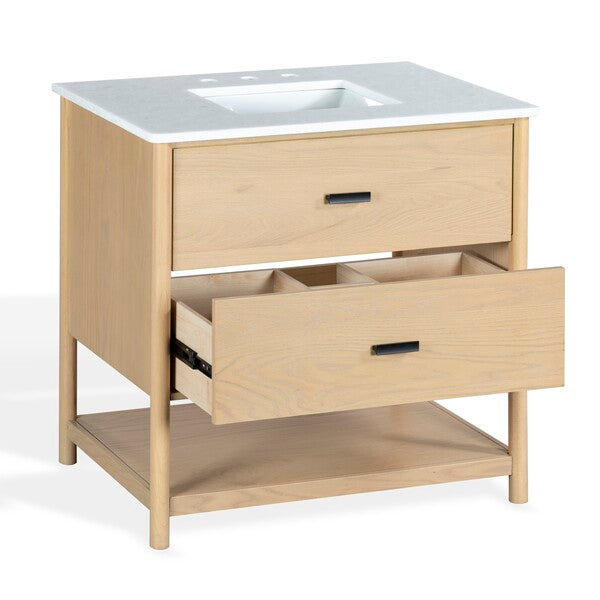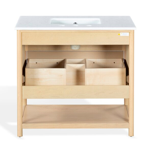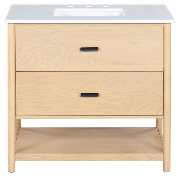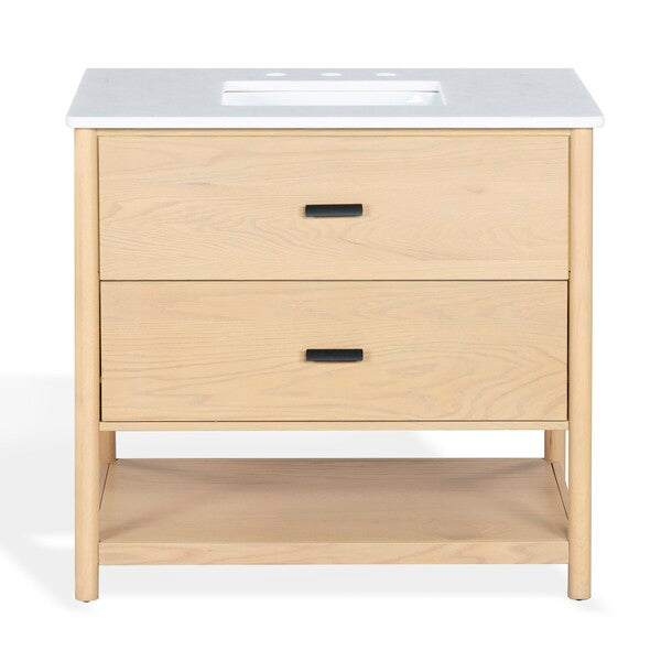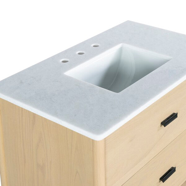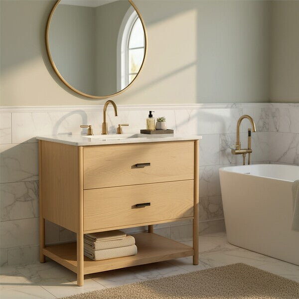 Introducing the Jaylessa 36 inch single vanity in medium oak and white a blend of form and function. This piece adds an elegant touch to your bathroom with its thoughtful design and versatile color palette. Crafted from durable wood and enhanced with sleek metal accents, the vanity exudes a sense of modern sophistication. The smooth marble counter creates an inviting space for your daily routine, while the ceramic sink offers a graceful finish.